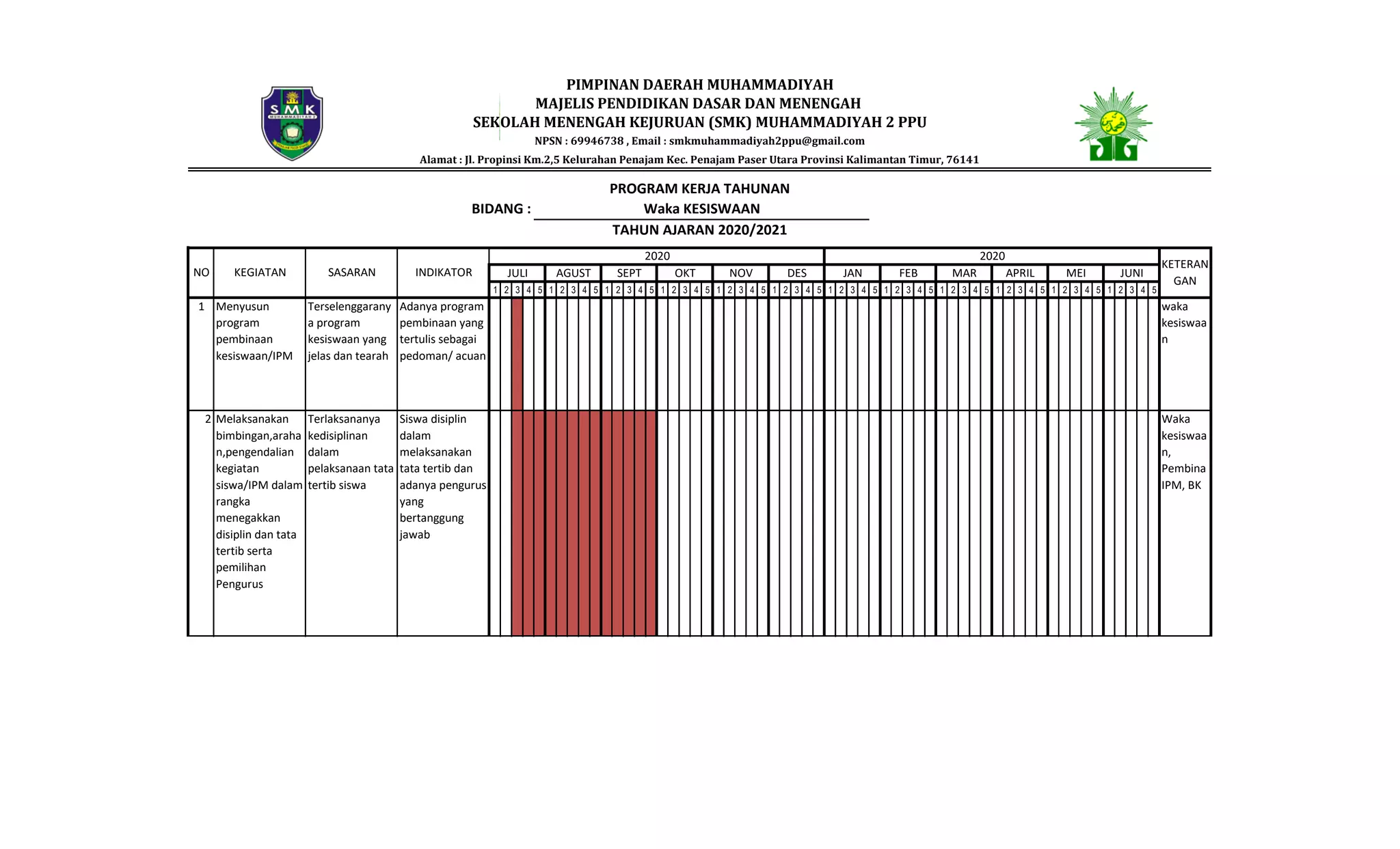 1. Dokumen tersebut merupakan program kerja tahunan waka kesiswaan SMK Muhammadiyah 2 PPU tahun 2020 yang mencakup 11 kegiatan utama untuk membina siswa antara lain menyusun program kesiswaan, melaksanakan bimbingan siswa, membina pengurus organisasi siswa, menyusun jadwal pembinaan siswa secara berkala, dan melaksanakan koordinasi keamanan di sekolah.