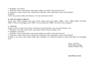 Dokumen ini adalah program kerja tahunan untuk program keahlian rekayasa perangkat lunak tahun 2020-2021, bertujuan memberikan acuan kinerja dan meningkatkan mutu lulusan. Terdapat 8 standar nasional pendidikan yang harus diimplementasikan, serta rencana kerja terperinci untuk mencapai tujuan tersebut. Penekanan juga diberikan pada evaluasi program sebelumnya untuk pengembangan yang berkelanjutan.