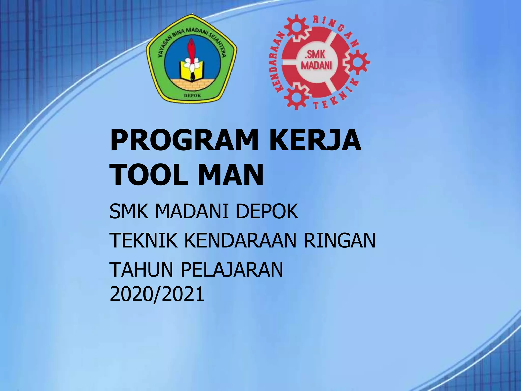 Dokumen ini merinci program kerja tool man di SMK Madani Depok untuk tahun pelajaran 2020/2021, dengan fokus pada pengelolaan bengkel dan pengembangan kompetensi siswa. Program ini mencakup aspek instruksi kerja, maintenance, perbaikan, serta kegiatan unit produksi yang mendukung pembelajaran praktis. Target kegiatan meliputi praktikum, uji sertifikasi kompetensi, dan proyek akhir, bertujuan untuk meningkatkan kemampuan teknis siswa.