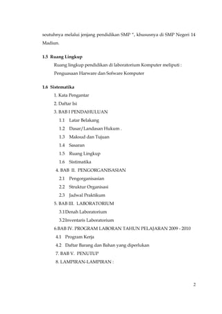 Dokumen ini membahas tentang pengorganisasian laboratorium komputer di SMP Negeri 14 Madiun. Terdapat penjelasan tentang struktur organisasi, pembagian tugas, dan jadwal penggunaan laboratorium komputer. Tujuannya adalah untuk mendukung proses pembelajaran TIK di sekolah tersebut.