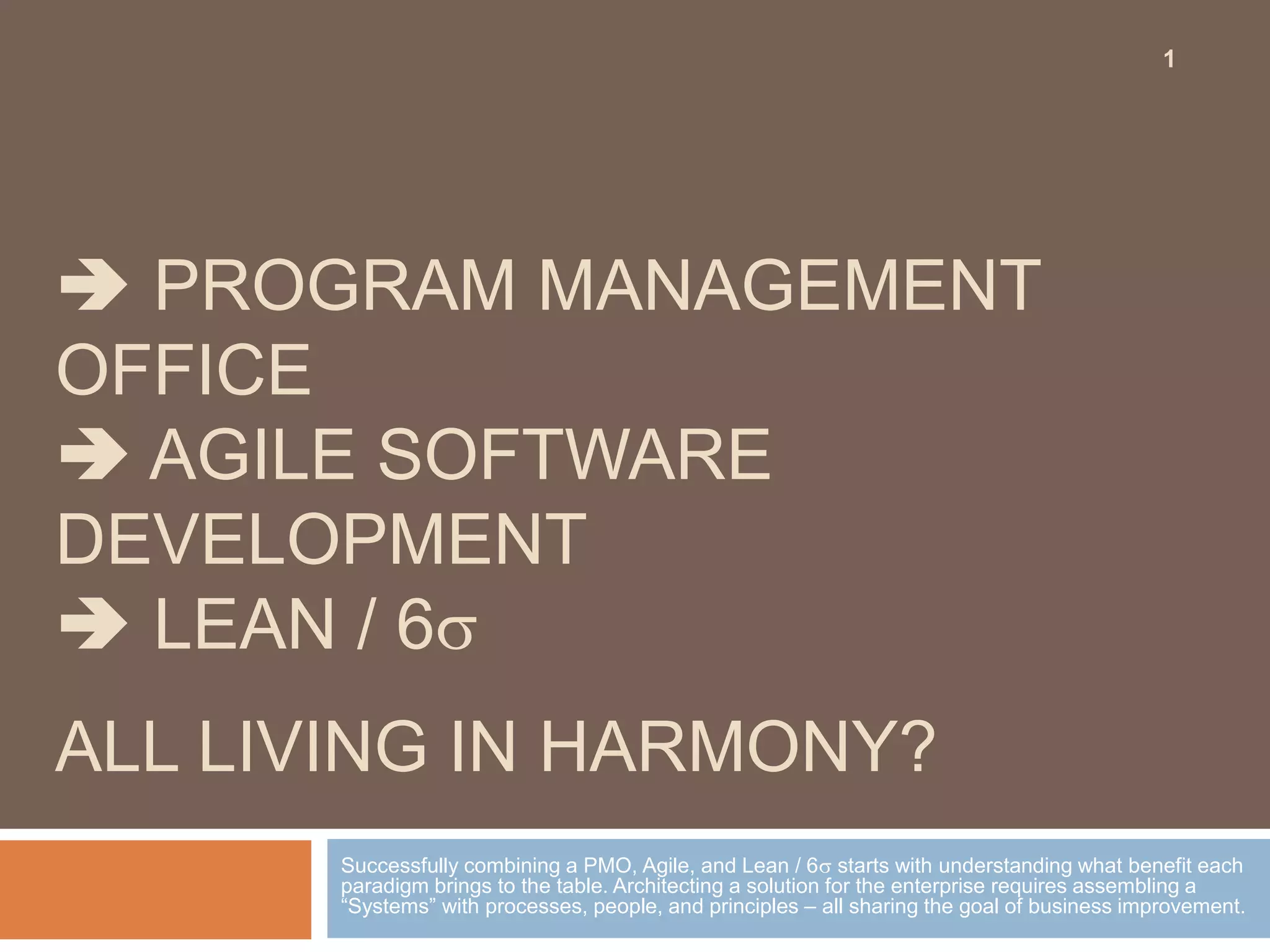 The document discusses the integration of program management offices (PMOs) with agile and lean methodologies to enhance business improvement. It outlines lean principles such as value stream mapping and waste reduction, emphasizing the importance of continuous improvement in software development. Key concepts include defining value from the customer's perspective and coordinating project management efforts to ensure efficient delivery of value to stakeholders.