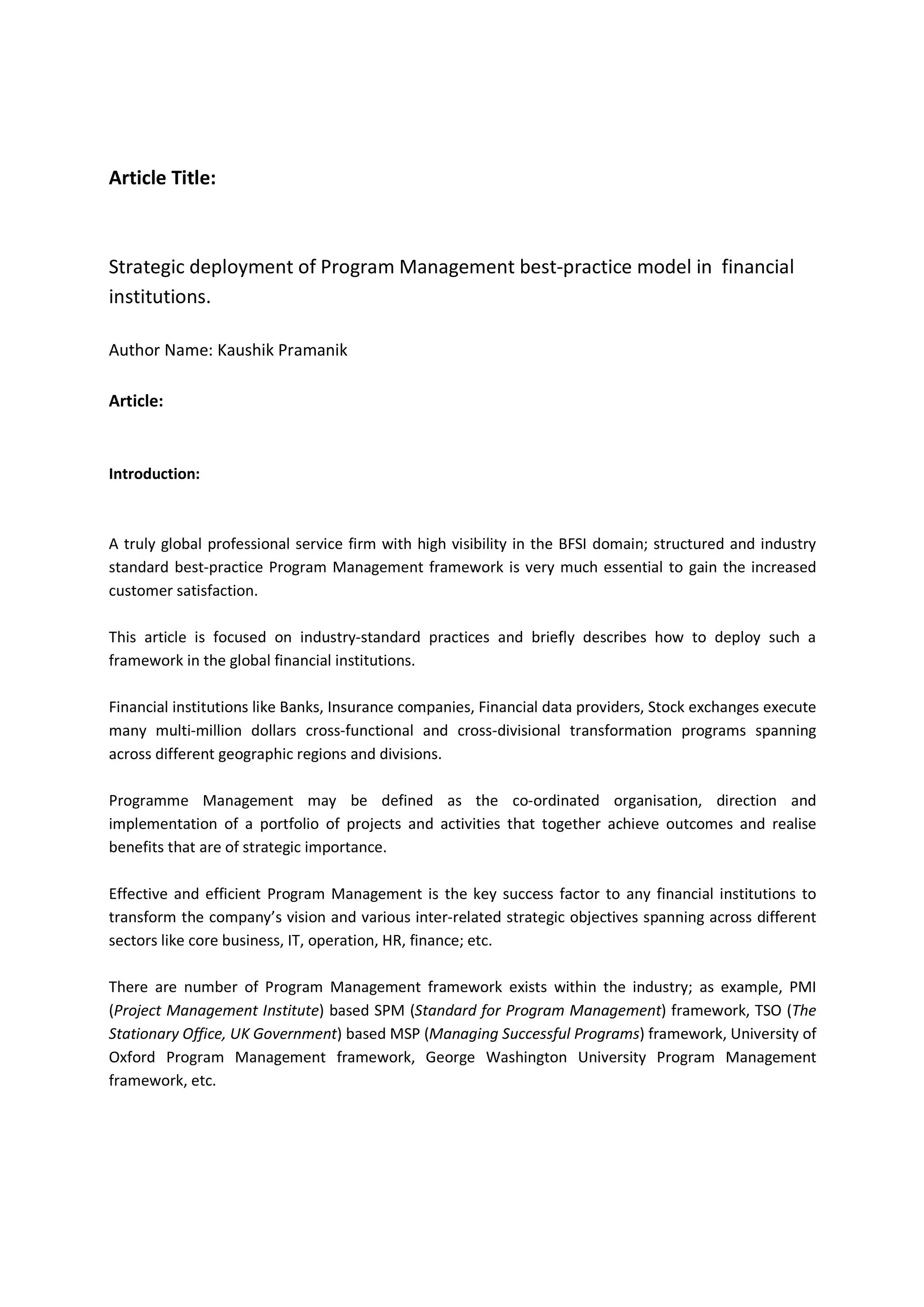 1) The document discusses deploying best practice program management frameworks in global financial institutions to improve customer satisfaction and outcomes.