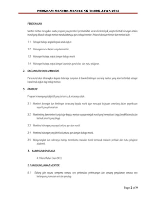 Program mentor-mentee di SK Tebok Jawa bertujuan membantu calon UPSR 2013 dengan membimbing dan memberi dorongan agar mencapai kecemerlangan akademik dan sahsiah. Program ini menggunakan sistem mentor di mana guru akan membimbing kelompok murid sebagai mentor. Objektifnya adalah membantu murid mencapai kejayaan dalam UPSR, membimbing murid menjadi yang bermotivasi tinggi dan berakhlak mulia.