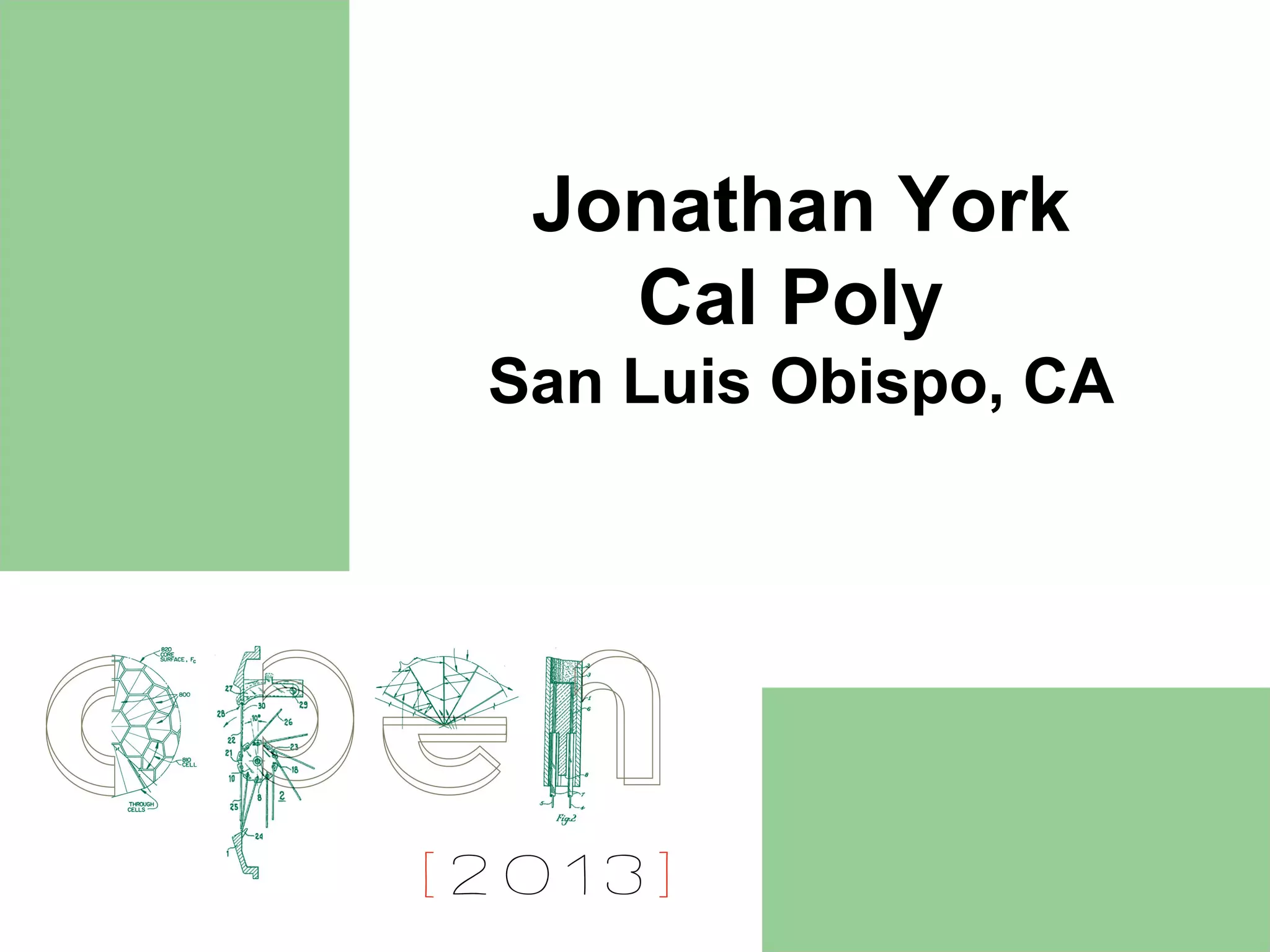 Jonathan York is a professor at Cal Poly in San Luis Obispo, California who teaches entrepreneurship. His areas of focus include helping students learn by doing, finding real world problems to solve through interdisciplinary work, and emphasizing science and technology. He believes mentors, coaches and bosses play an important role in students' work and rewards.