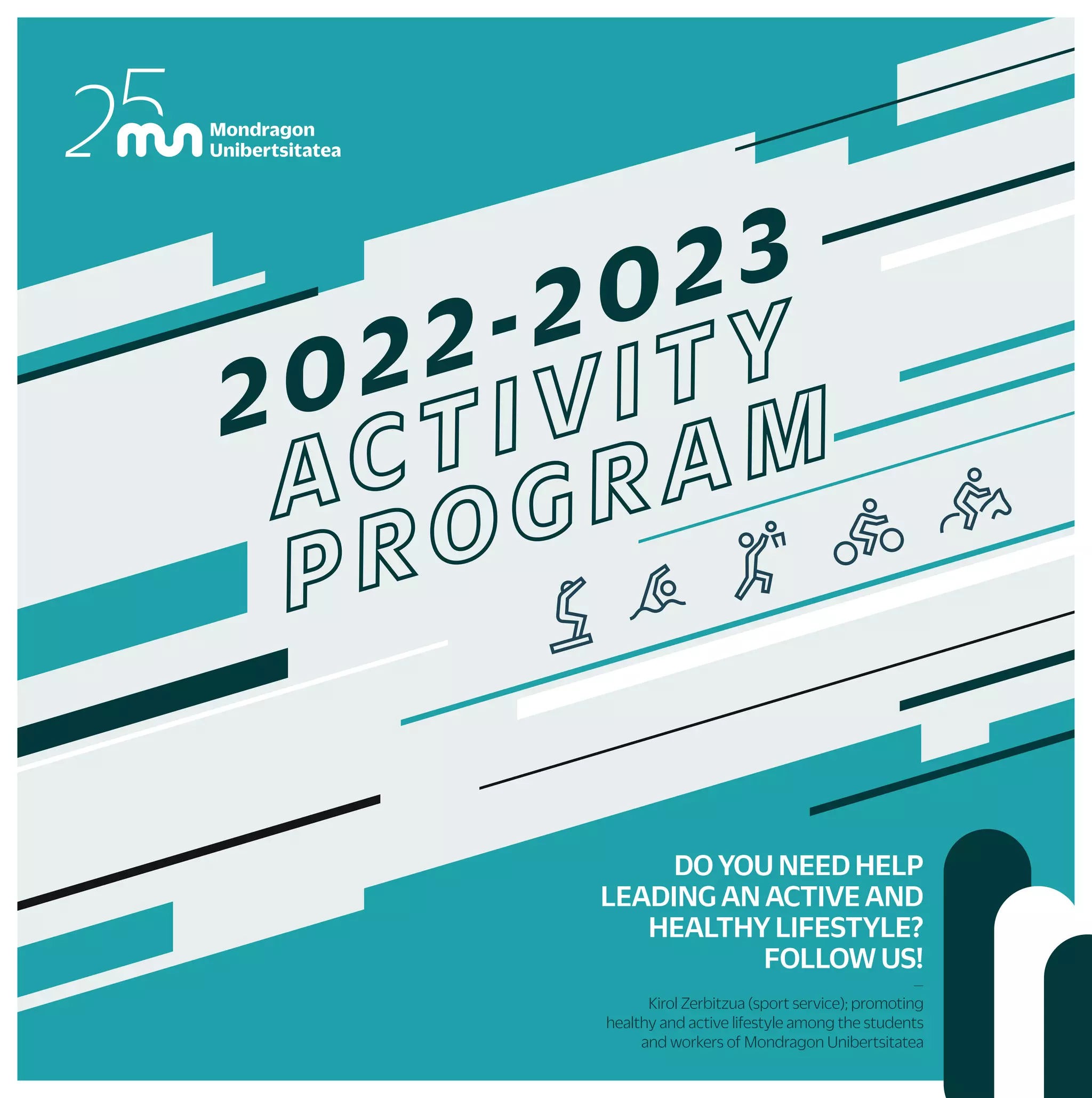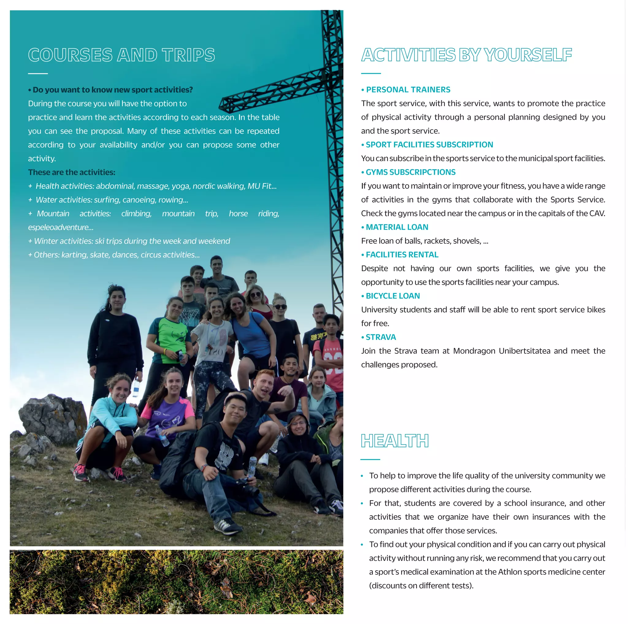 This document outlines the sports activities and championships offered by the Sport Service of Mondragon Unibertsitatea. It describes internal and external championships that students can participate in, including the Championship of Mondragon Unibertsitatea, the Basque Country's University Sport Championship, and the Spanish University Sport Championship. It also details training teams, opportunities for student collaboration, activities students can do independently, other active proposals like thematic weeks, and courses and trips offered in different sports. The goal is to promote healthy and active lifestyles among Mondragon Unibertsitatea students and workers.