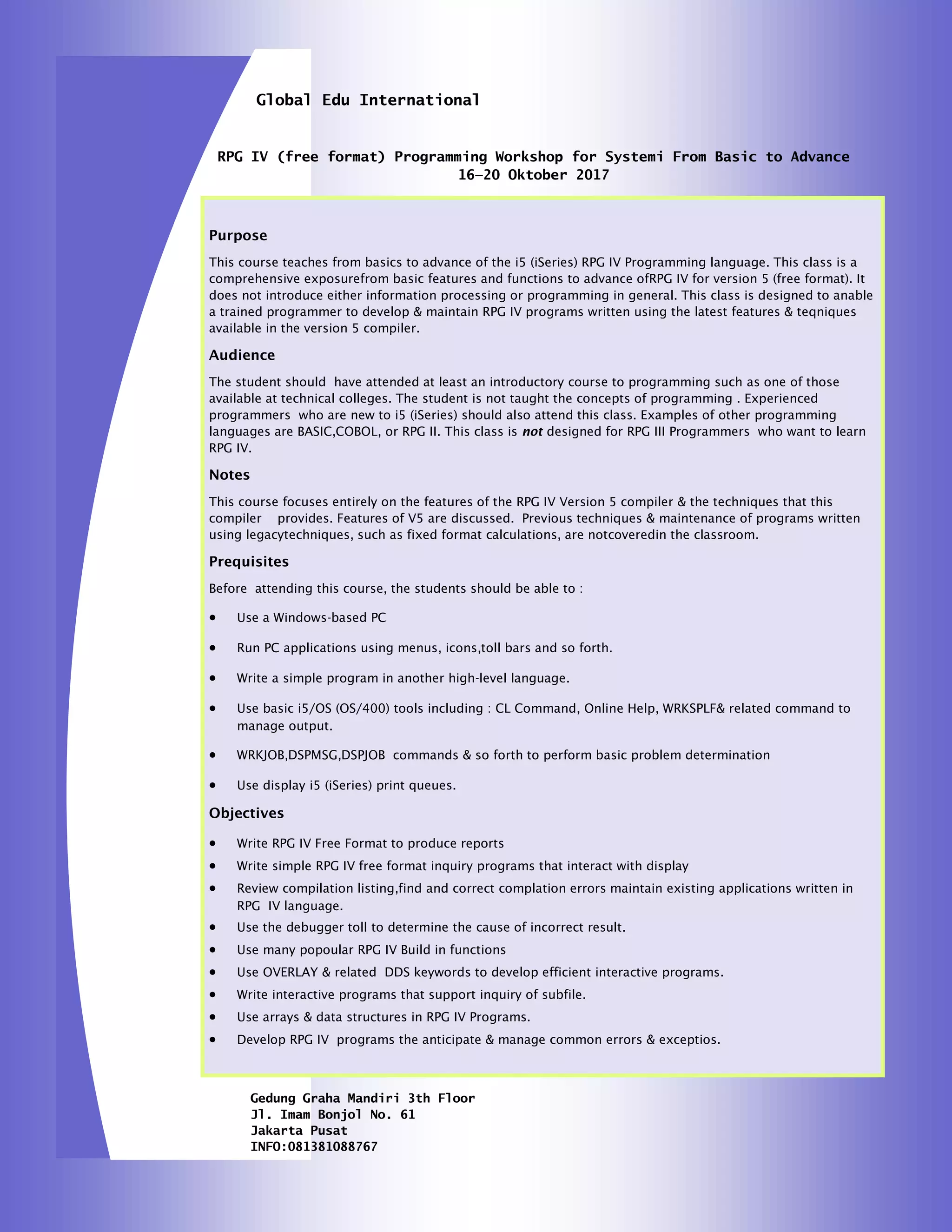 This document outlines a course on RPG IV programming language designed for trained programmers, focusing on version 5 features. It requires prior programming knowledge and aims to enable students to develop and maintain RPG IV programs, including compiling issues and interactive programming techniques. The course will cover several programming concepts with practical applications, scheduled for October 16-20, 2017.