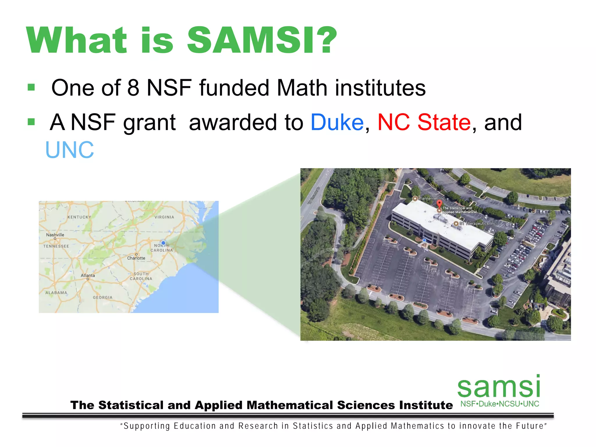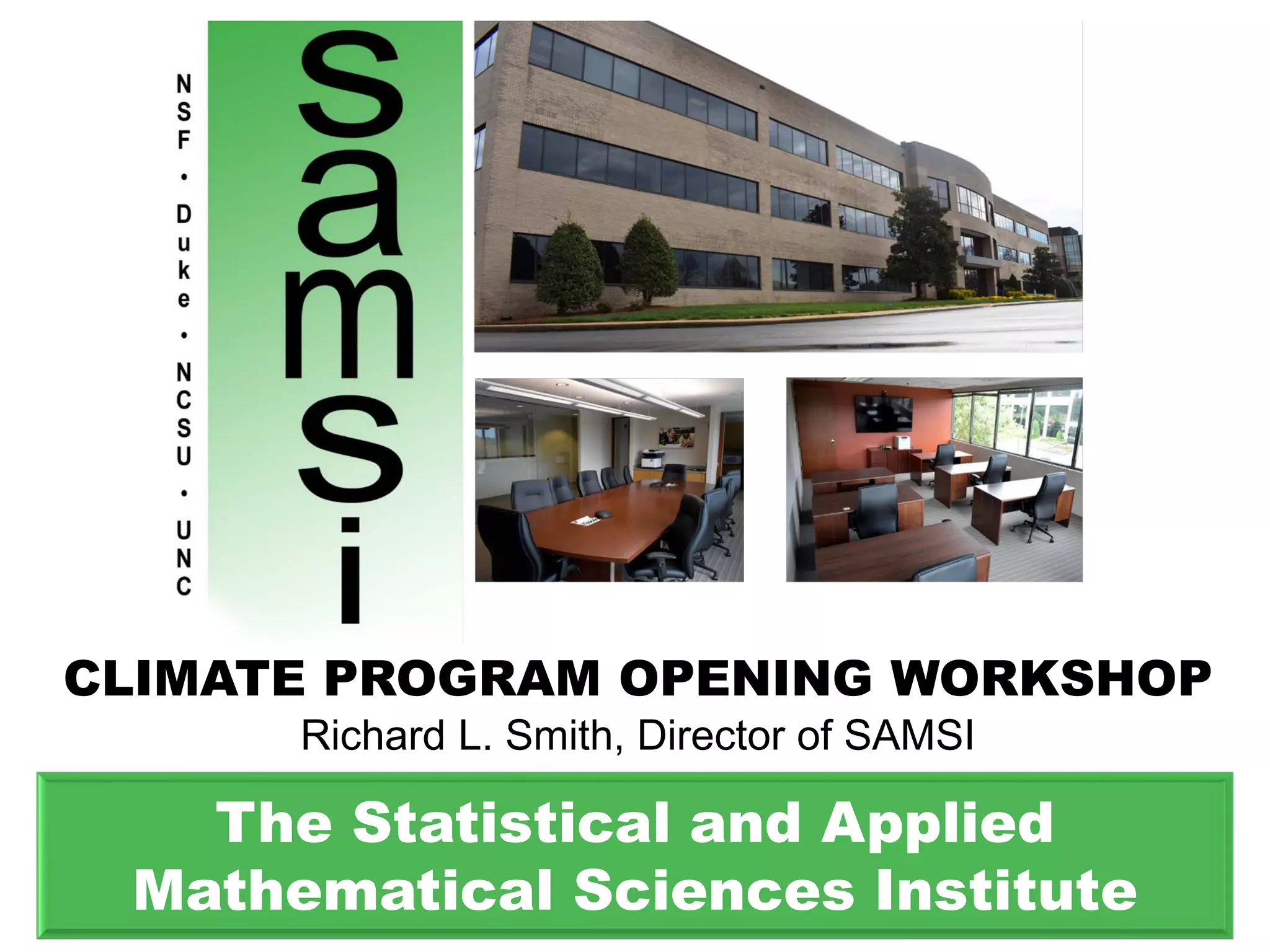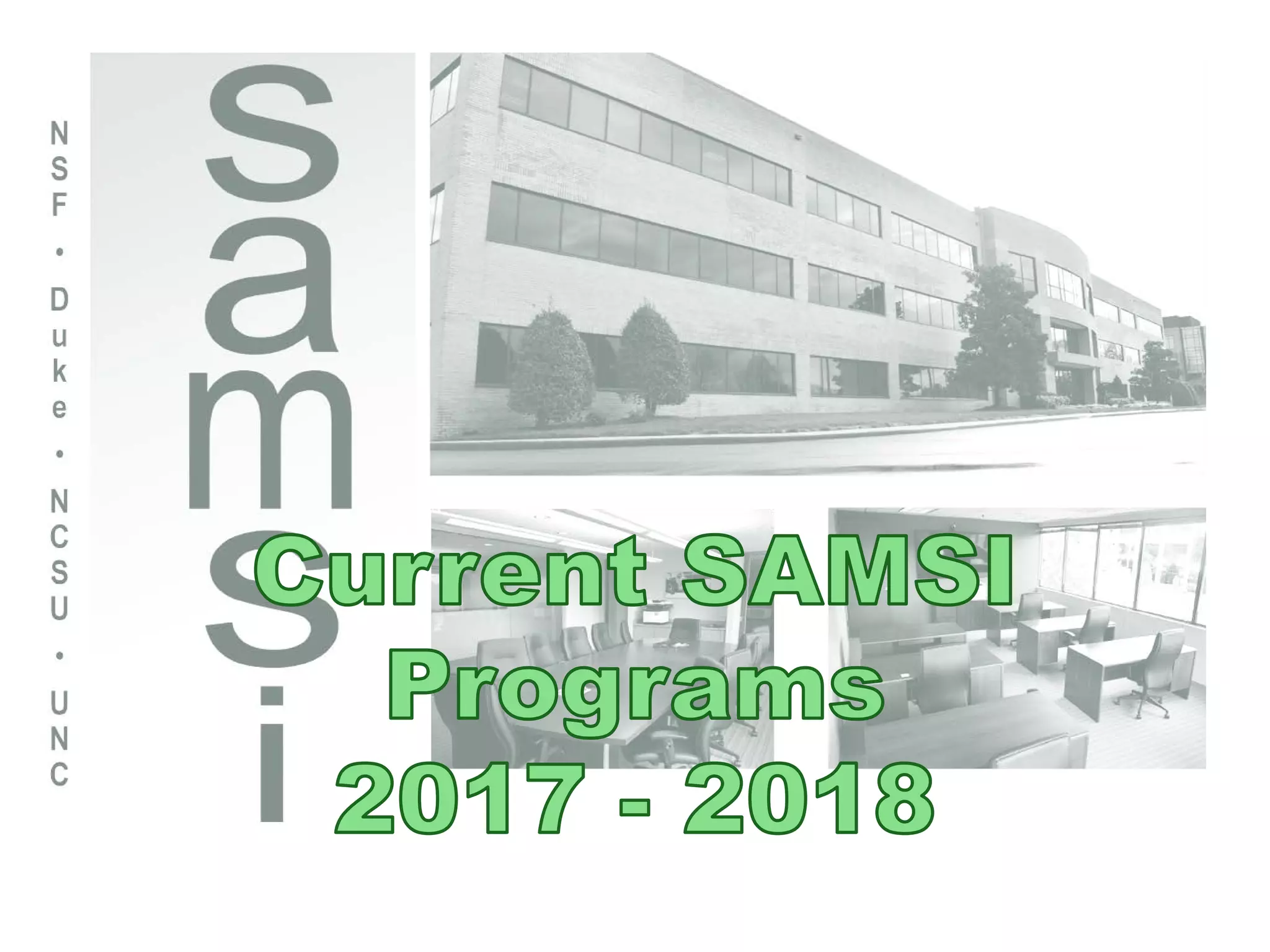 SAMSI is a National Science Foundation funded institute established in 2002 and hosted by Duke, NC State, and UNC. It brings together statisticians, mathematicians, and domain scientists to work on challenging data-driven problems. This document provides an overview of SAMSI and its new Climate Program, including its mission, leadership, research areas, planned working groups and workshops.