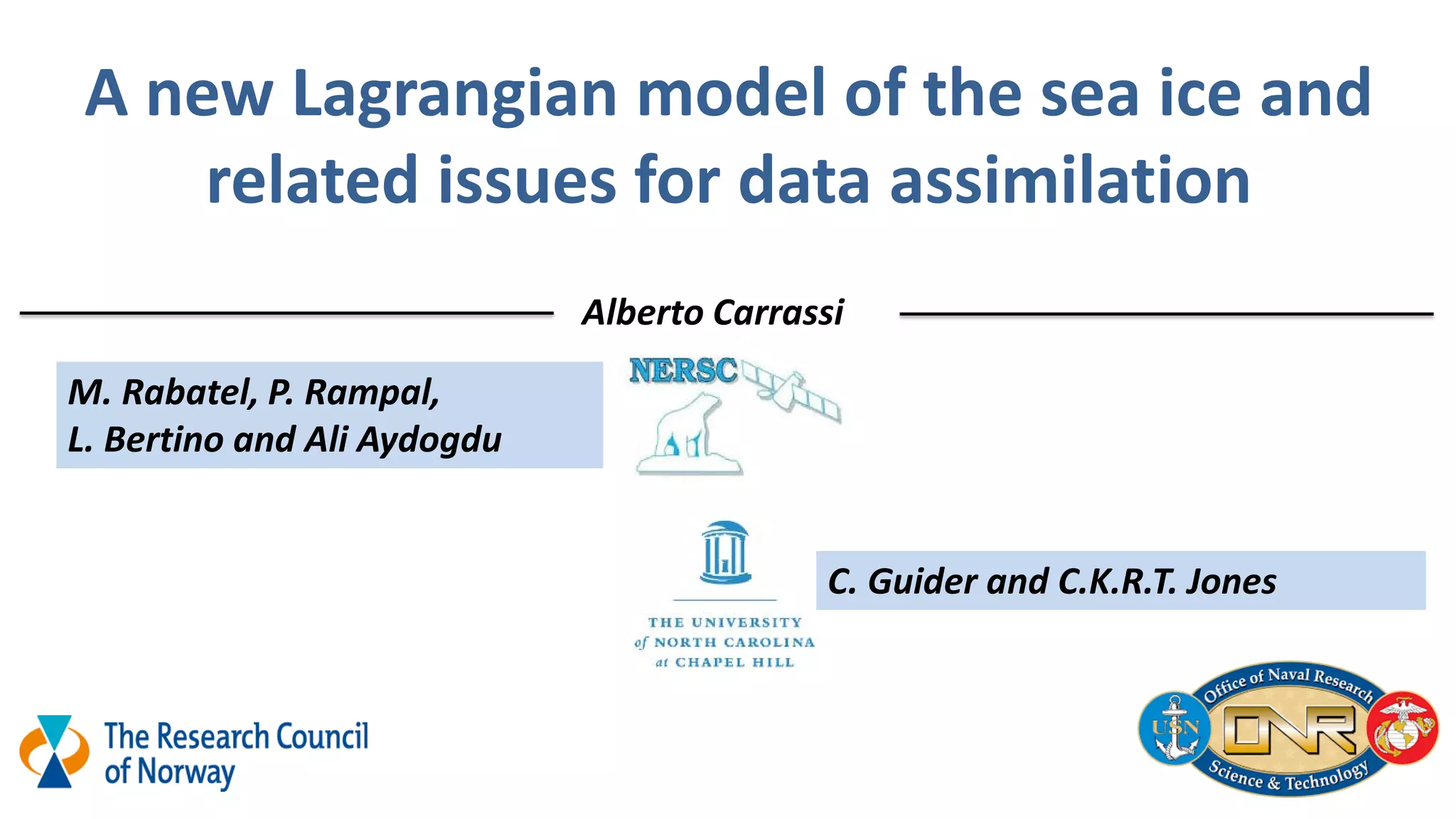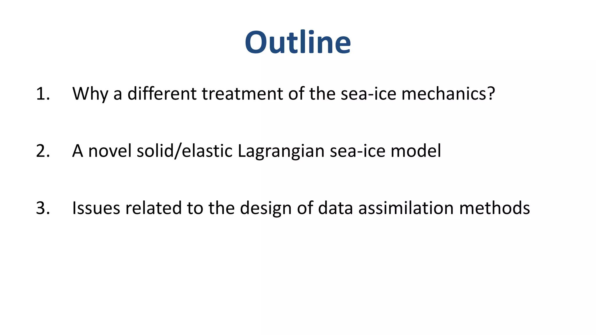 The document presents a new Lagrangian model for sea ice that addresses the shortcomings of existing methods, particularly in data assimilation and ice mechanics. It discusses the operational and simulation performance of the model, including comparisons with previous systems, and highlights issues like biases, variability, and the need for better data assimilation techniques. The findings emphasize the model's capability to simulate sea ice dynamics accurately, while proposing new methodologies for integrated data approaches.