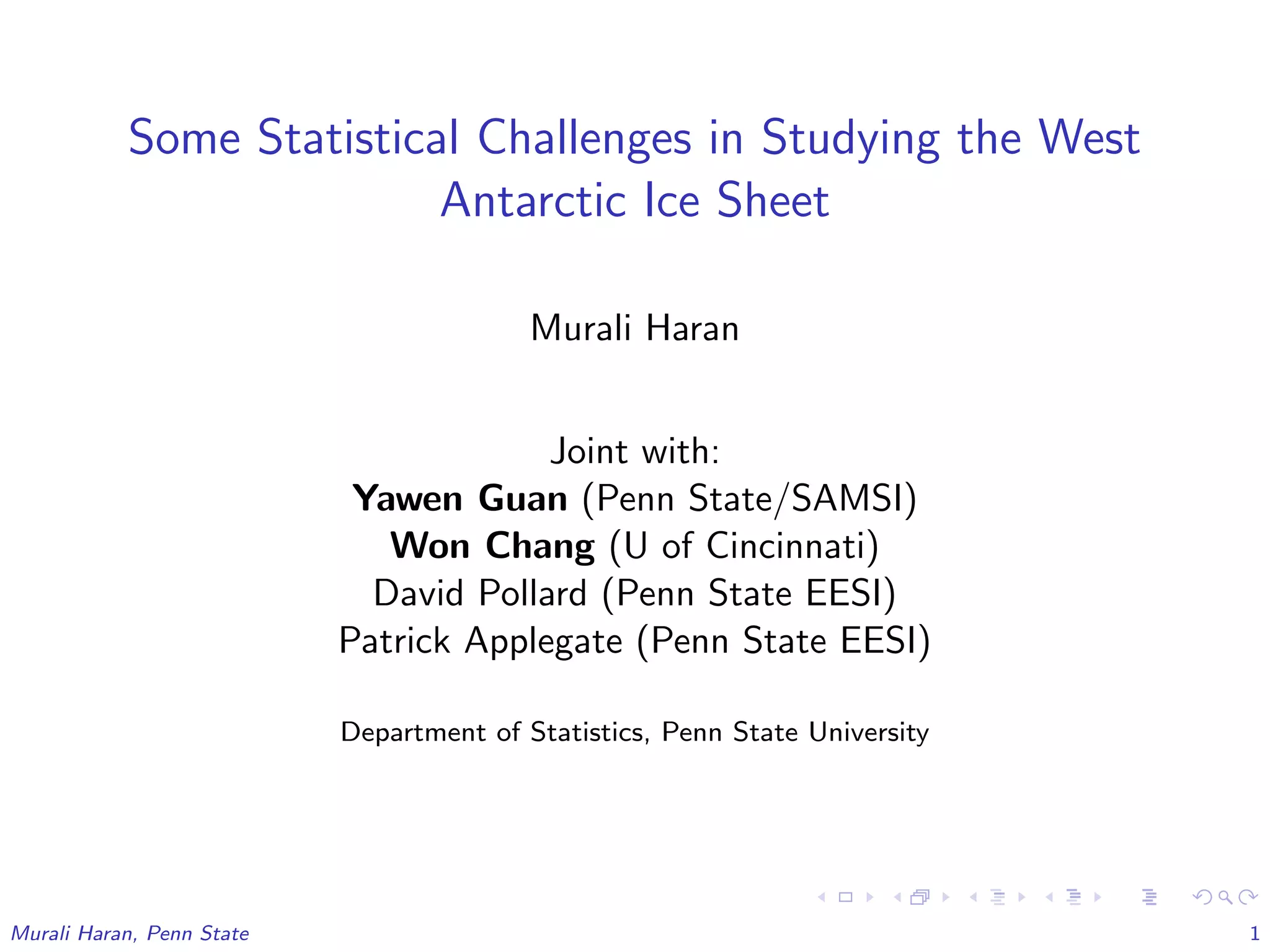 The document discusses the statistical challenges in studying the West Antarctic Ice Sheet, emphasizing the importance of understanding ice sheet dynamics and making accurate projections of ice behavior to assess potential sea level rise. It outlines the use of sophisticated statistical methods, including model emulation and calibration, to infer parameters and bridge data discrepancies in ice sheet modeling. The work also highlights the need for integrating multiple data sources to improve the accuracy of projections related to ice streams and overall ice sheet stability.