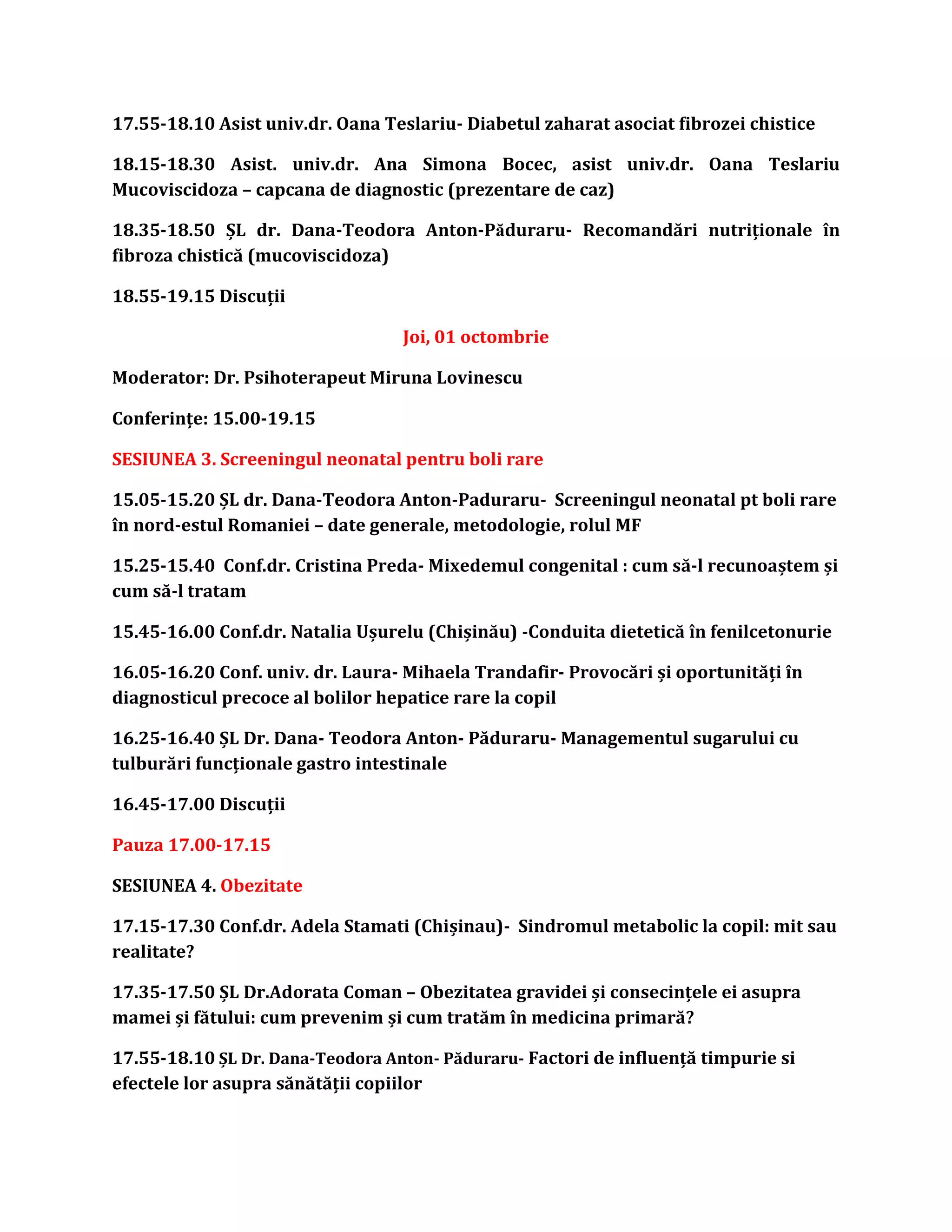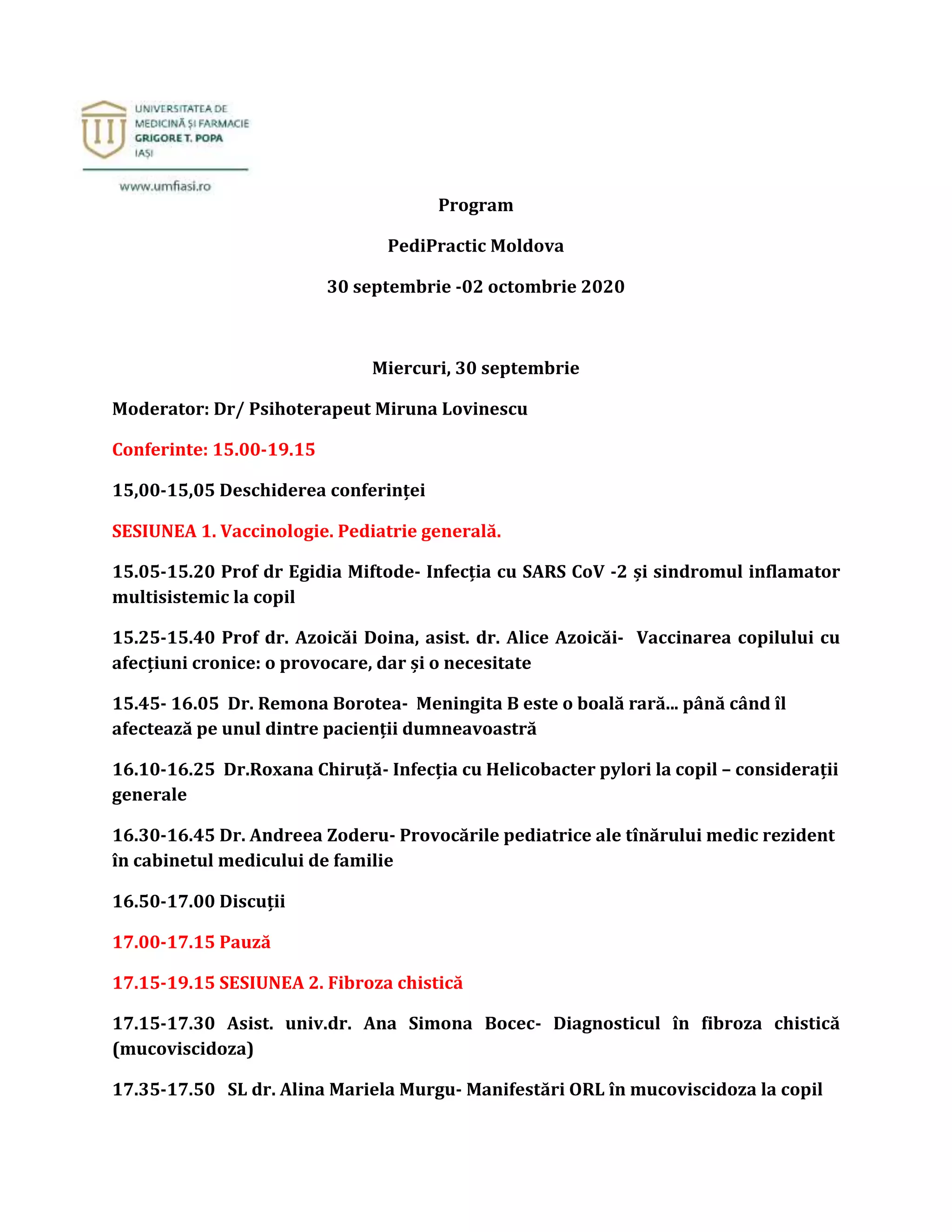 Conferința anuală de pediatrie din Moldova s-a desfășurat între 30 septembrie și 2 octombrie 2020, cu sesiuni moderată de dr. psihoterapeut Miruna Lovinescu. Temele abordate au inclus vaccinologia, fibroza chistică, screeningul neonatal pentru boli rare, obezitatea și neurologia pediatrică. La eveniment au participat experți care au discutat despre diversele provocări și soluții medicale în domeniul pediatriei.