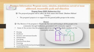 The proposed program, named 'my kids names,' aims to provide free care and housing services to vulnerable adults in the community, particularly the elderly, by leveraging fundraisers and community support. Key services include housing, healthcare, transportation, and nutritional support to address issues of starvation, technology access, and abuse protection. The program will operate in a small town in the U.S., seeking grants to fund offices and services, while focusing on quality service delivery and education on the benefits of insurance.
