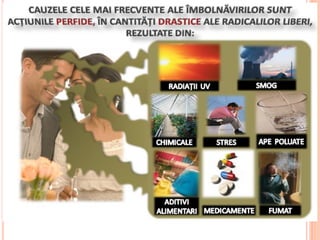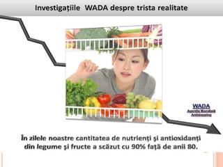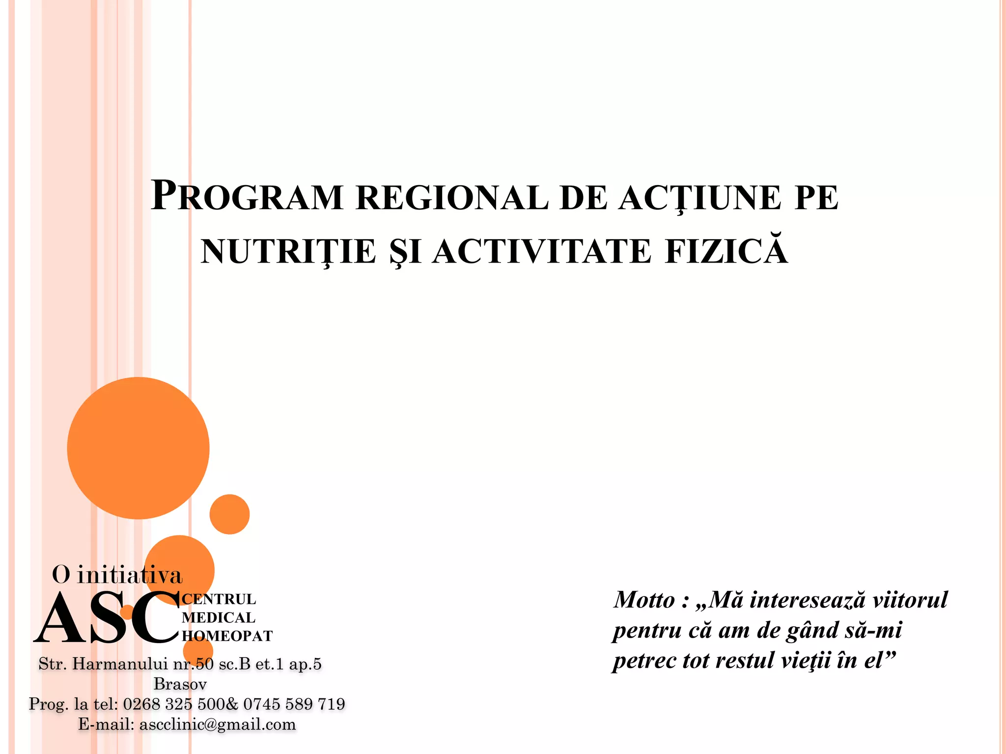 Documentul prezintă un program regional de acțiune axat pe nutriție și activitate fizică, subliniind importanța antioxidanților în combaterea radicalilor liberi și menținerea sănătății. Se discută despre scăderea conținutului de vitamine și minerale în alimentele consumate, evidențiind nevoie de evaluări nutriționale și corecții. Centrul medical homeopat oferă servicii diverse pentru consultanță în nutriție, psihologie și alte terapii pentru a sprijini sănătatea comunității.