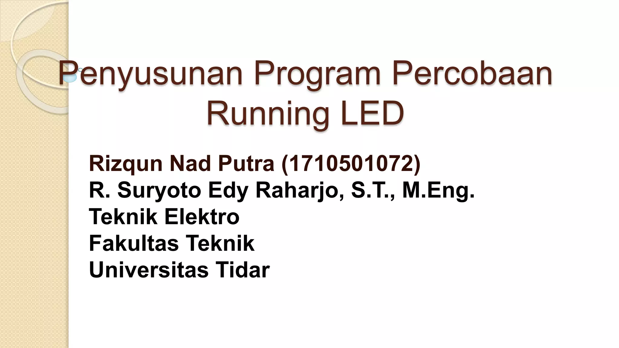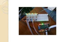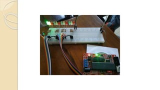 The document outlines experimental programs for running LED configurations using a microcontroller, detailing three distinct trials. Each program includes setup commands, LED connection configurations, and timed routines for turning LEDs on and off. The purpose is to demonstrate various LED patterns through controlled output on specific microcontroller ports.