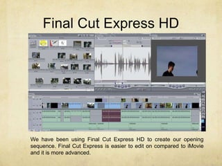 The document discusses the video and audio editing programs used to create an opening sequence and soundtrack. Final Cut Express HD was used for editing as it is more advanced than iMovie. Garage Band was used to create the original soundtrack as it contains many tunes that can be combined. iMovie was also used to import clips in a way that allows them to work on Final Cut Express HD with sound and best quality.