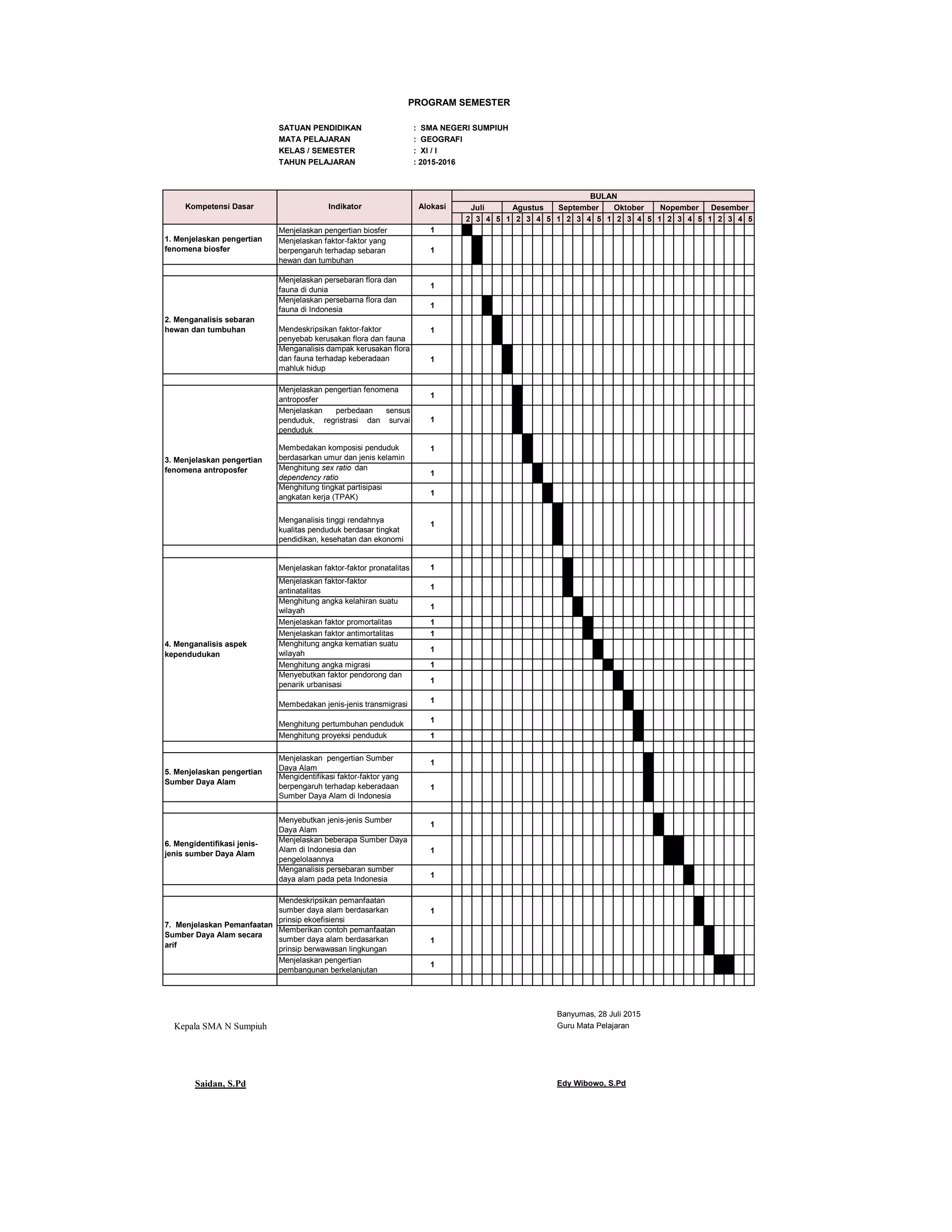 Dokumen ini adalah kurikulum mata pelajaran geografi untuk siswa SMA Negeri Sumpiuh dalam tahun pelajaran 2015-2016. Materi mencakup pengertian biosfer, sebaran flora dan fauna, faktor-faktor yang mempengaruhi kerusakan lingkungan, serta analisis kependudukan dan sumber daya alam. Selain itu, terdapat penjelasan tentang pembangunan berkelanjutan dan pemanfaatan sumber daya alam yang berwawasan lingkungan.
