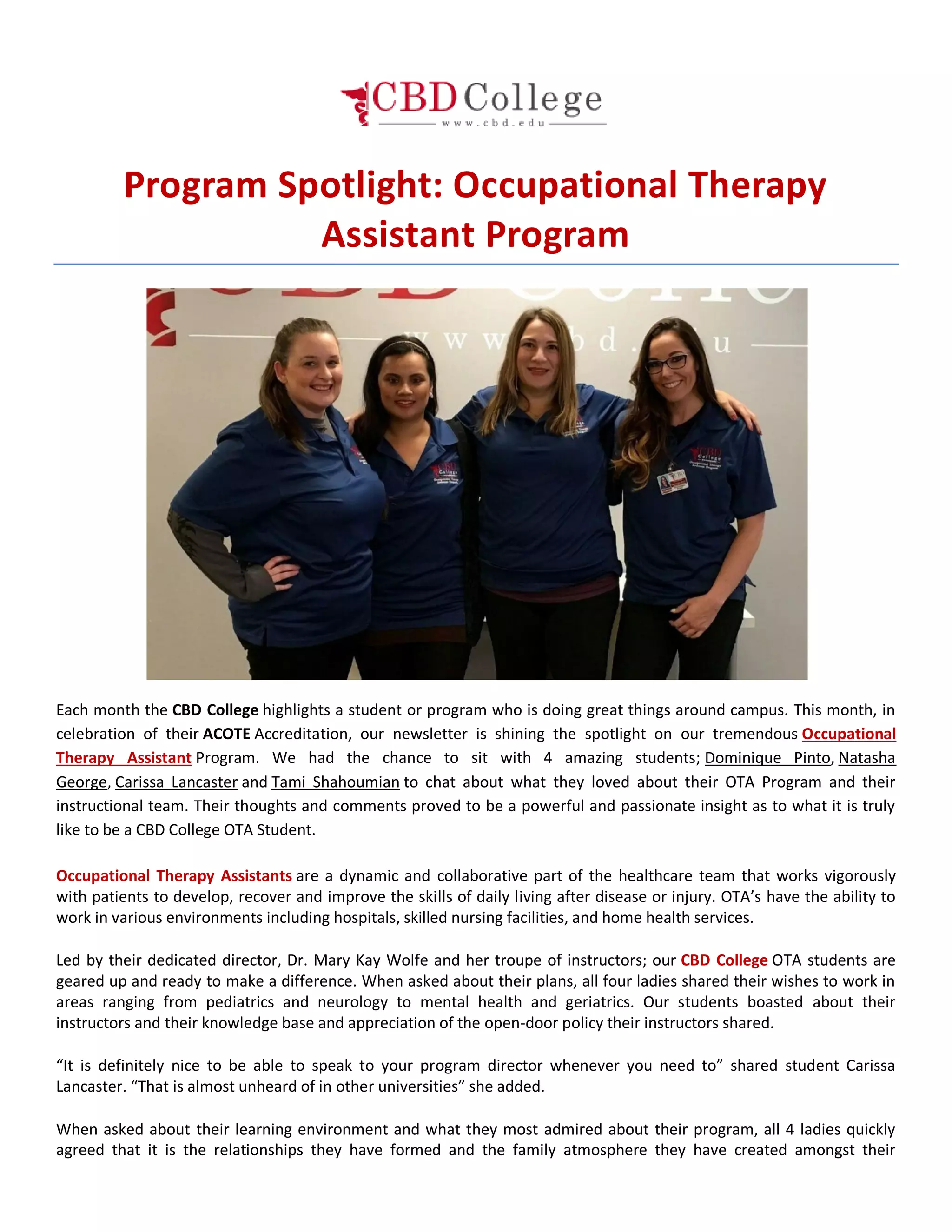 This month's spotlight highlights the accredited Occupational Therapy Assistant (OTA) program at CBD College, showcasing students' testimonials about their positive experiences and strong relationships with instructors. The four featured students expressed their enthusiasm for various fields, including pediatrics and geriatrics, and praised the supportive, family-like environment of their program. CBD College recognizes the dedication of both its OTA faculty and students as key factors in achieving accreditation and preparing for clinical rotations.
