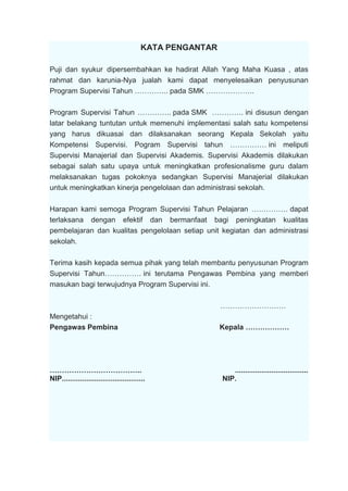 Program supervisi tahun pelajaran [tahun] di SMK [nama sekolah] meliputi supervisi akademis dan manajerial. Supervisi akademis bertujuan meningkatkan profesionalisme guru dan kualitas pembelajaran, sedangkan supervisi manajerial bertujuan meningkatkan kinerja pengelolaan sekolah. Berdasarkan evaluasi tahun sebelumnya, aspek-aspek yang perlu diperbaiki antara lain pengembangan indikator, penggunaan metode pembelaj