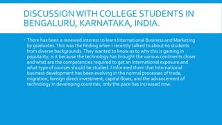 The document discusses the rising interest among students in pursuing international business education to become global citizens, highlighting the importance of adaptability and understanding of global economic dynamics. It argues that master’s programs, particularly in international business, can equip students with essential competencies for the rapidly changing global marketplace. The author emphasizes the need for application-oriented education that respects ethical standards and promotes sustainable development.