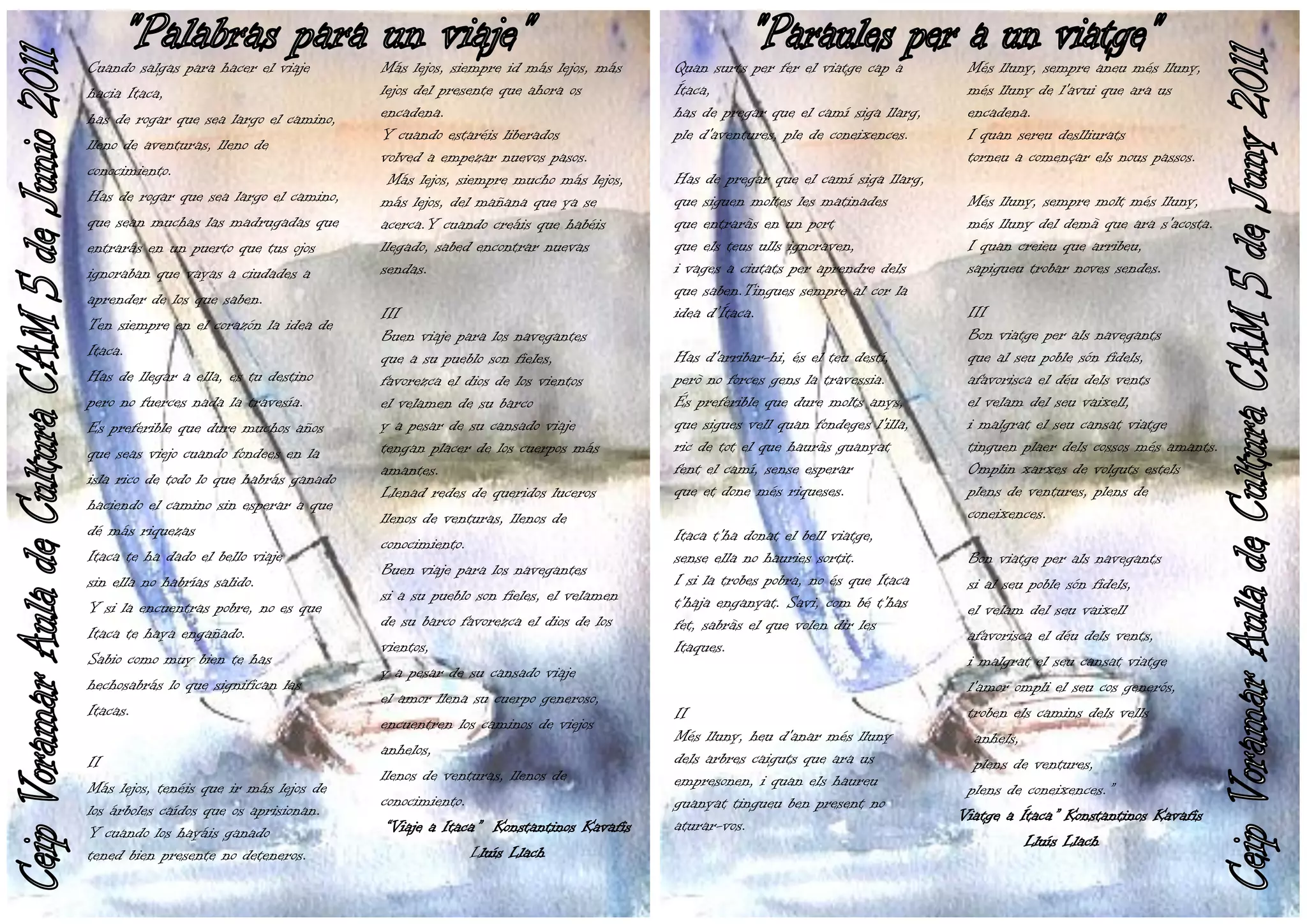 Itaca te ha dado el bello viaje sense ella no hauries sortit. Bon viatge per als navegants