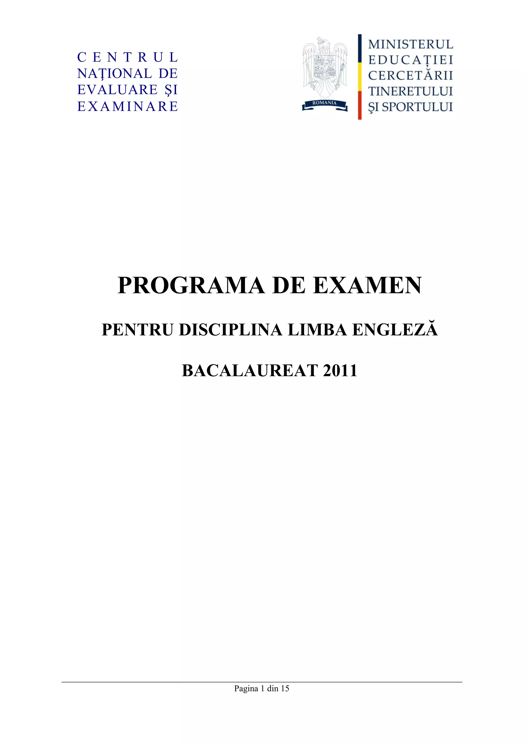 Documentul prezintă programa de examen pentru disciplina limba engleză în cadrul bacalaureatului din 2011, stipulând competențele necesare pentru absolvirea liceului și detaliile examenului, care include evaluarea competențelor lingvistice prin probe de înțelegere a textului audiat, probă scrisă și probă orală. Se specifică nivelurile de competență conform Cadrului European Comun de Referință pentru diferitele tipuri de licee și specializări. Competențele de evaluat cuprind abilități de receptare, producere, interacțiune și mediere a mesajelor, fiecare având detalii specifice pentru contextul academic și profesional.