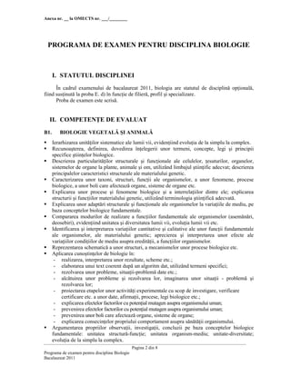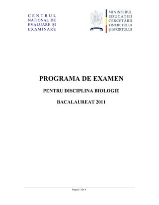 Documentul reprezintă programa de examen pentru disciplina biologie la bacalaureat 2011, stabilind statutul biologiei ca disciplină opțională. Acesta detaliază competențele ce trebuie evaluate, inclusiv cunoștințele despre biologia vegetală și animală, anatomia și fiziologia umană, genetică și ecologie. De asemenea, se specifică conținuturile pentru clasele IX și X și cele pentru clasele XI și XII, citind structura, funcțiile organismelor și procesul de ereditate.