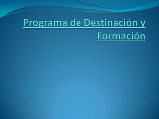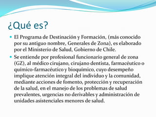 El Programa de Destinación y Formación del Ministerio de Salud de Chile busca aumentar el acceso a la atención odontológica y apoyar el nivel primario de atención. Los cirujanos dentistas recién titulados pueden postular al programa y son evaluados en base a su calificación, experiencia y trabajos presentados. Los seleccionados trabajan como funcionarios públicos por 3 años antes de poder postular a becas de especialización. El programa busca fortalecer el sistema de salud a través de la capacitación y distribución de profes