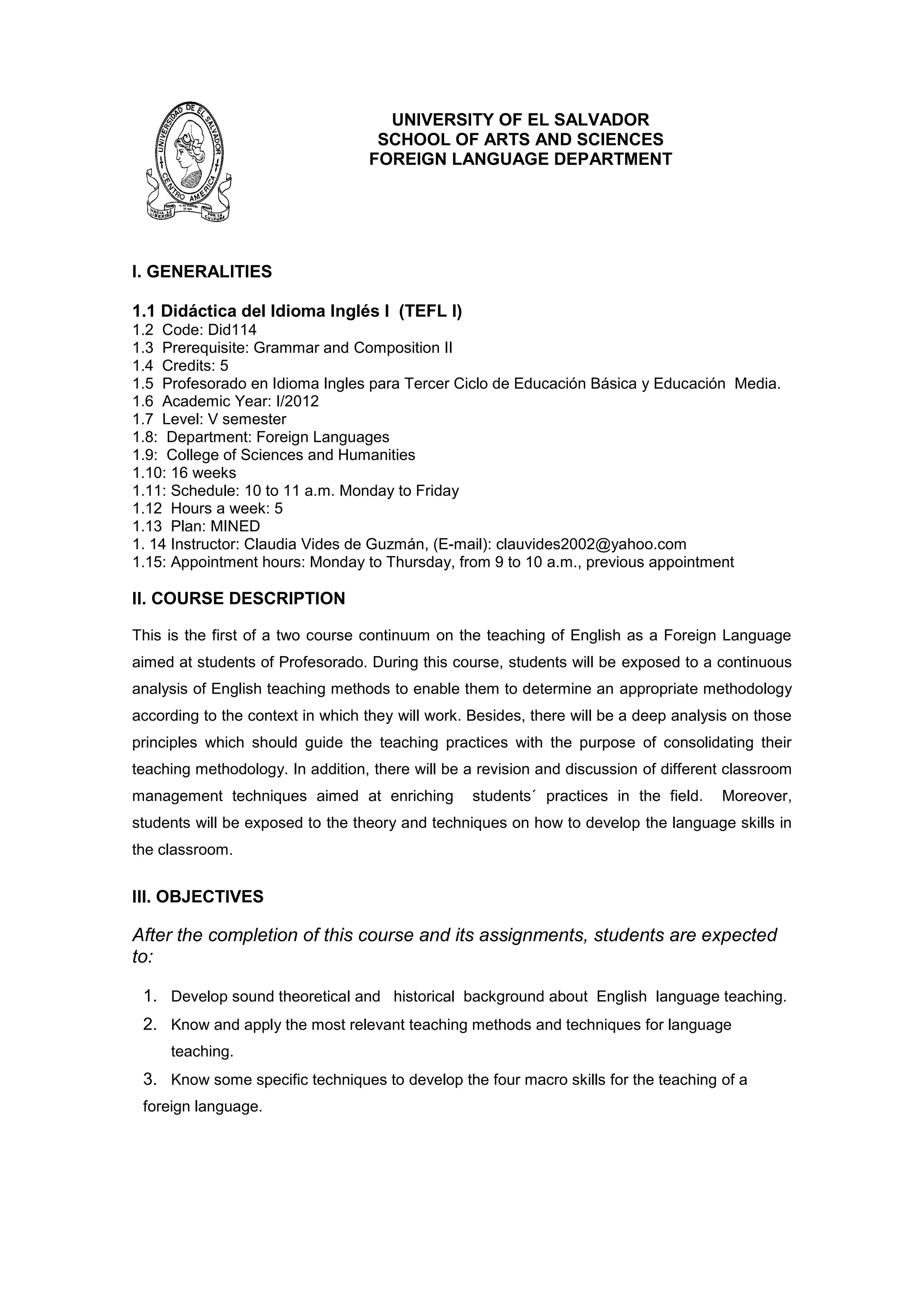 This document outlines the syllabus for an English teaching methods course called TEFL I at the University of El Salvador School of Arts and Sciences Foreign Language Department. The course is aimed at training students to teach English as a foreign language. It will cover theories and techniques for developing language skills, classroom management strategies, and different teaching methods through activities like discussions, presentations and lesson planning. Students will be evaluated on oral presentations, practice teaching, assignments, a midterm exam and reading quizzes. The course will help students gain the knowledge and skills needed to effectively teach English.