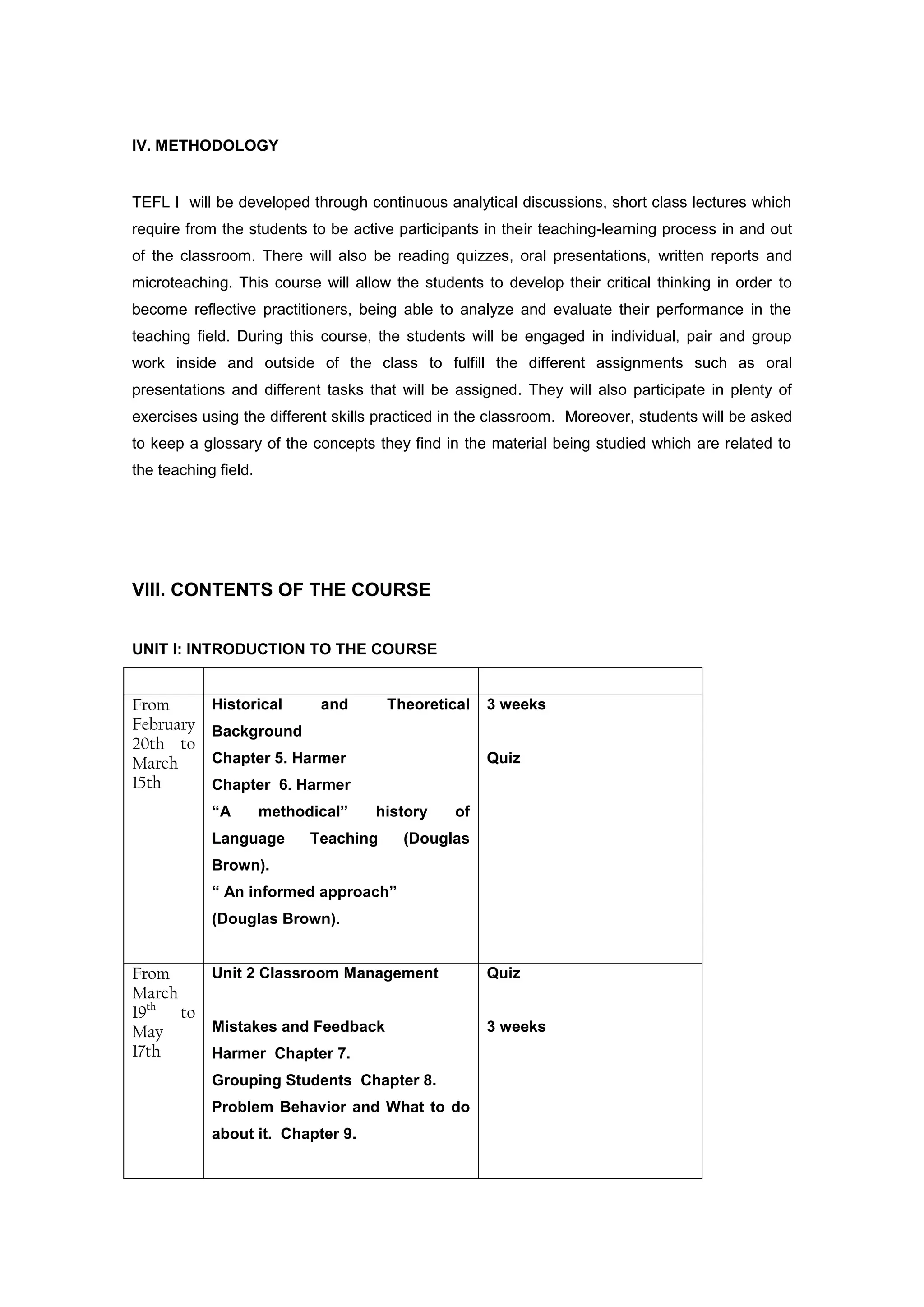 This document outlines the syllabus for a course called "Teaching English as a Foreign Language I" at the University of El Salvador. The course is aimed at training students to teach English at the secondary level. Over the course of 16 weeks, students will learn about language teaching methods and techniques, classroom management, and how to teach the four language skills through lectures, discussions, presentations and lesson planning activities. Students will be evaluated based on oral presentations, practice teaching demonstrations, assignments, a midterm exam and reading quizzes. The goal is for students to develop a theoretical foundation and practical skills for teaching English as a foreign language.