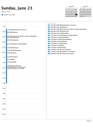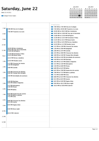 This document contains the schedule for a weekend camp at Colegio Franco Ingles. The schedule includes activities from Saturday morning until Sunday afternoon. On Saturday, activities range from arriving at the campsite to games, meals, and evening activities like a bonfire and disco night. Sunday's schedule includes wake up, breakfast, morning games, packing up, and returning to the school by bus in the afternoon. The document provides timing for each scheduled activity.