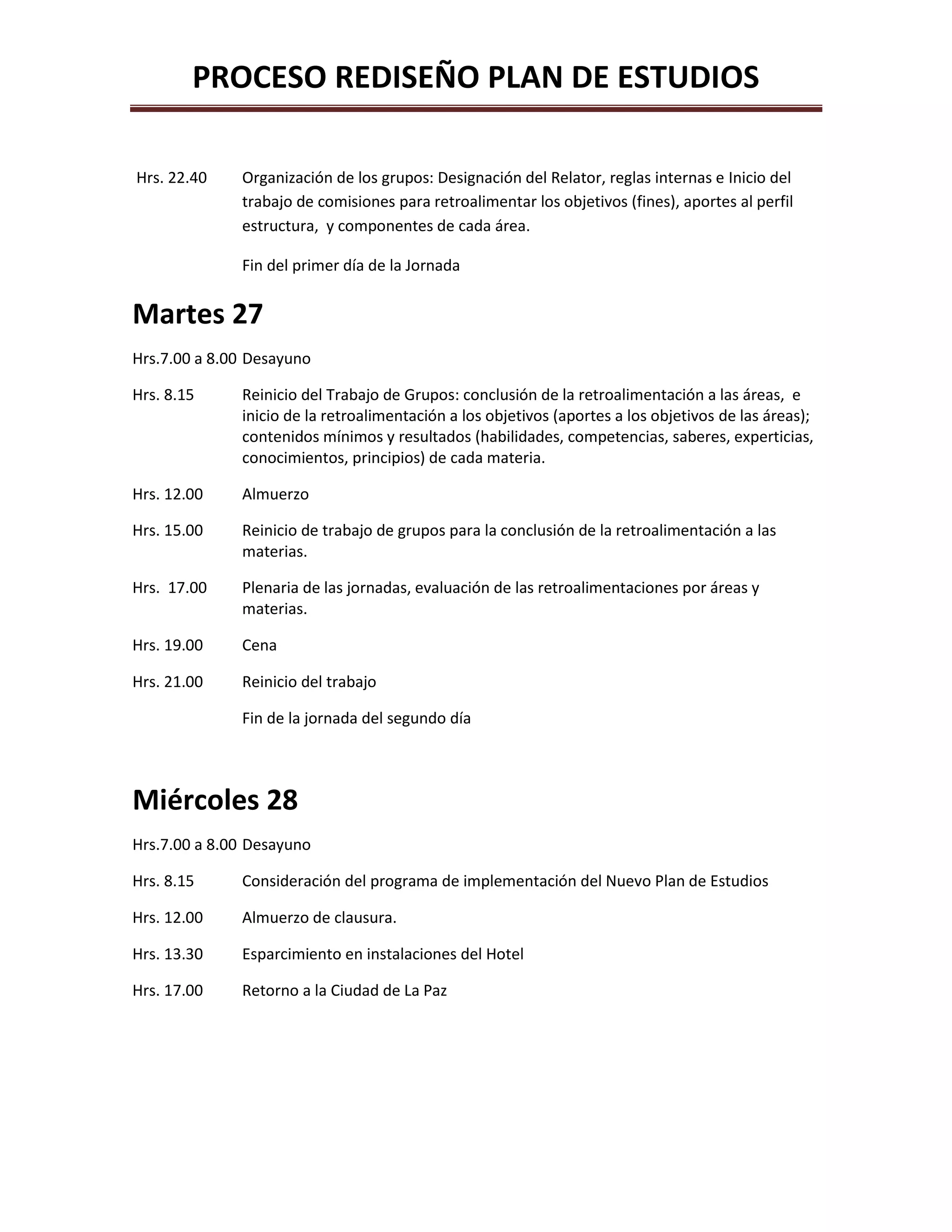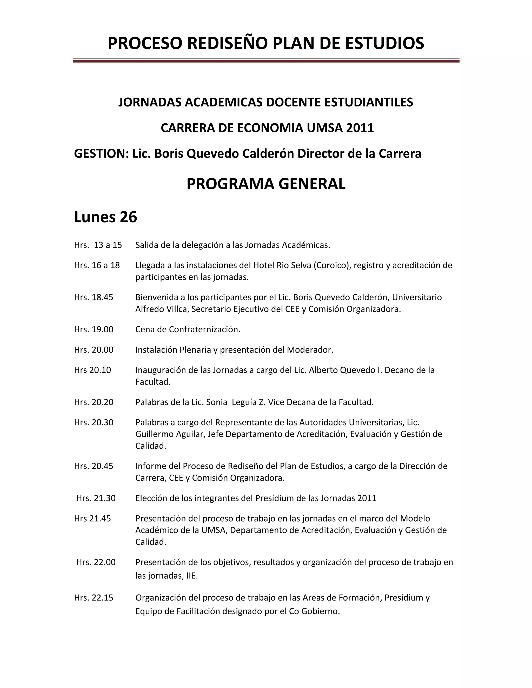 Este documento presenta el programa general de las Jornadas Académicas Docente Estudiantiles de la Carrera de Economía de la Universidad Mayor de San Andrés (UMSA) en 2011. El objetivo principal de las jornadas es el rediseño del plan de estudios de la carrera a través de la retroalimentación de docentes y estudiantes sobre los objetivos, estructura y componentes de cada área y materia. El programa detalla la agenda de las tres días de jornadas, que incluye sesiones plenarias, trabajo en grupos, presentaciones y