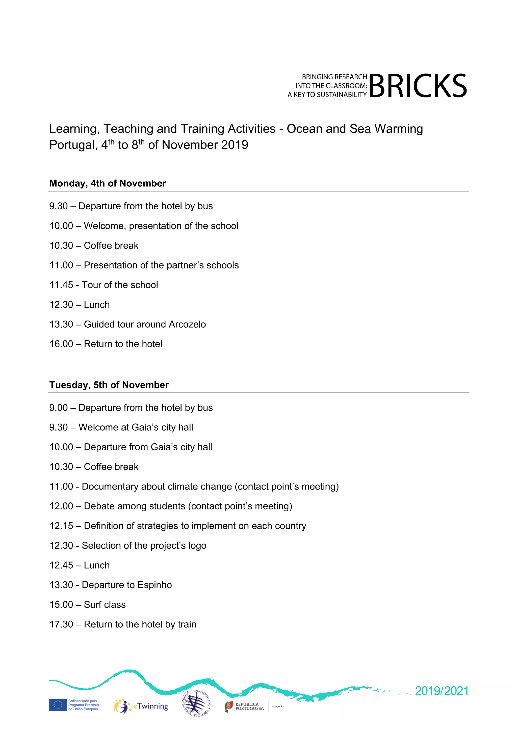 This document outlines the schedule for a school trip in Portugal from November 4th to 8th, 2019 focused on learning about ocean and sea warming. The schedule includes visits to schools, tours of cities and sites, and workshops/presentations on climate change and eTwinning (an online platform for schools). Each day consists of transportation to and from locations, presentations or activities related to the theme, breaks for coffee and lunch, and return transportation to the hotel each evening.