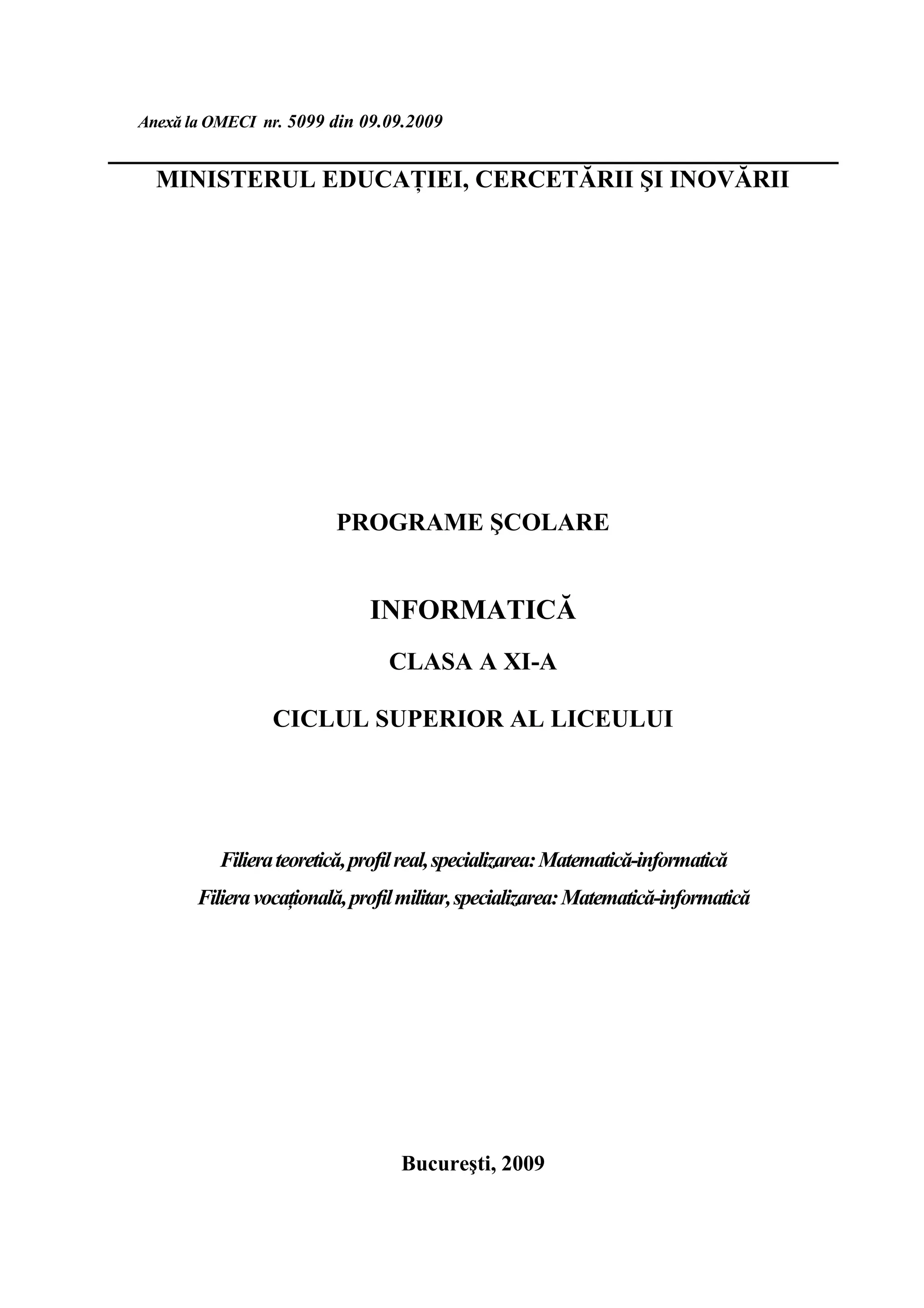 Documentul prezintă programa școlară pentru disciplina informatică, clasa a XI-a, pentru specializările matematică-informatică din filiera teoretică și vocațională. Se alocă 4 ore pe săptămână, incluzând o oră de teorie și 3 ore de activități practice, iar programul vizează dezvoltarea competențelor cheie europene. Programa include competențe generale și specifice, conținuturi de învățare organizate tematic și sugestii metodologice pentru profesorii care predau disciplina.