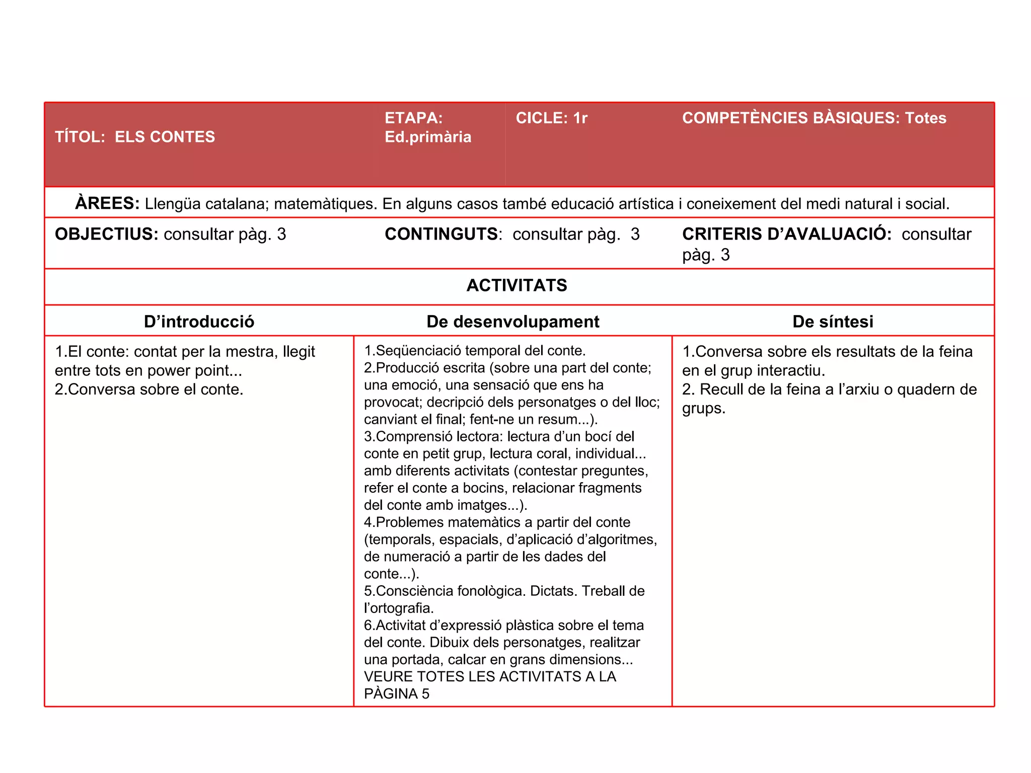 PROGRAMACIONS PRIMER CICLE(CURS 2010/2011) Conversa sobre els resultats de la feina en el grup interactiu. Recull de la feina a l’arxiu o quadern de grups. Seqüenciació temporal del conte. Producció escrita (sobre una part del conte; una emoció, una sensació que ens ha provocat; decripció dels personatges o del lloc; canviant el final; fent-ne un resum...). Comprensió lectora: lectura d’un bocí del conte en petit grup, lectura coral, individual... amb diferents activitats (contestar preguntes, refer el conte a bocins, relacionar fragments del conte amb imatges...). Problemes matemàtics a partir del conte (temporals, espacials, d’aplicació d’algoritmes, de numeració a partir de les dades del conte...). Consciència fonològica. Dictats. Treball de l’ortografia. Activitat d’expressió plàstica sobre el tema del conte. Dibuix dels personatges, realitzar una portada, calcar en grans dimensions... VEURE TOTES LES ACTIVITATS A LA PÀGINA 5 El conte: contat per la mestra, llegit entre tots en power point... Conversa sobre el conte. De síntesi De desenvolupament D’introducció ACTIVITATS CRITERIS D’AVALUACIÓ: consultar pàg. 3 CONTINGUTS : consultar pàg. 3 OBJECTIUS: consultar pàg. 3 ÀREES: Llengüa catalana; matemàtiques. En alguns casos també educació artística i coneixement del medi natural i social. COMPETÈNCIES BÀSIQUES: Totes CICLE: 1r ETAPA: Ed.primària TÍTOL: ELS CONTES