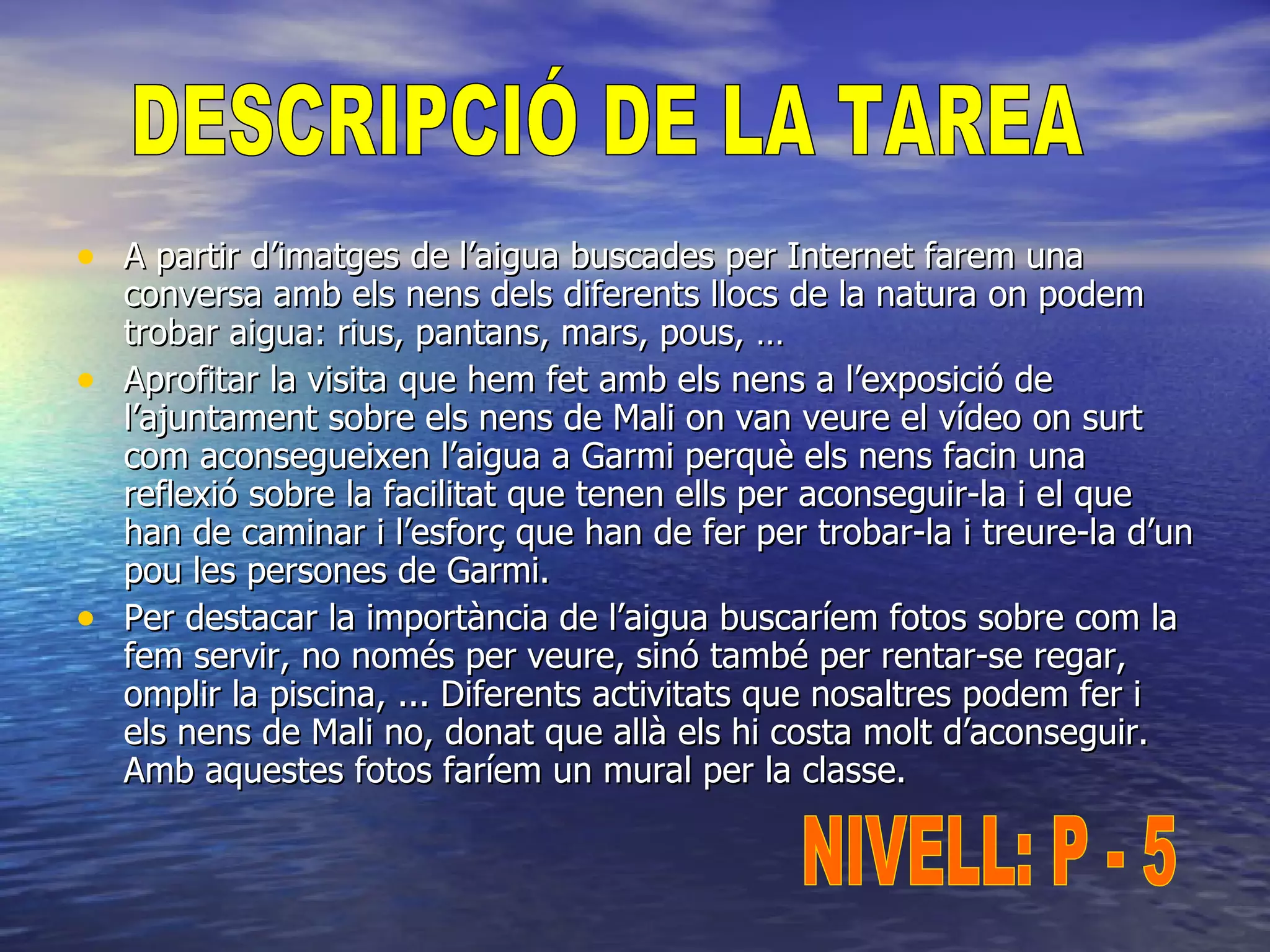 A partir d’imatgesde l’aigua buscades per Internet farem una conversa amb els nens dels diferents llocs de la natura on podem trobar aigua: rius, pantans, mars, pous, … Aprofitar la visita que hem fet amb els nens a l’exposició de l’ajuntament sobre els nens de Mali on van veure el vídeo on surt com aconsegueixen l’aigua a Garmi perquè els nens facin una reflexió sobre la facilitat que tenen ells per aconseguir-la i el que han de caminar i l’esforç que han de fer per trobar-la i treure-la d’un pou les persones de Garmi. Per destacar la importància de l’aigua buscaríem fotos sobre com la fem servir, no només per veure, sinó també per rentar-se regar, omplir la piscina, ... Diferents activitats que nosaltres podem fer i els nens de Mali no, donat que allà els hi costa molt d’aconseguir. Amb aquestes fotos faríem un mural per la classe. DESCRIPCIÓ DE LA TAREA NIVELL: P - 5