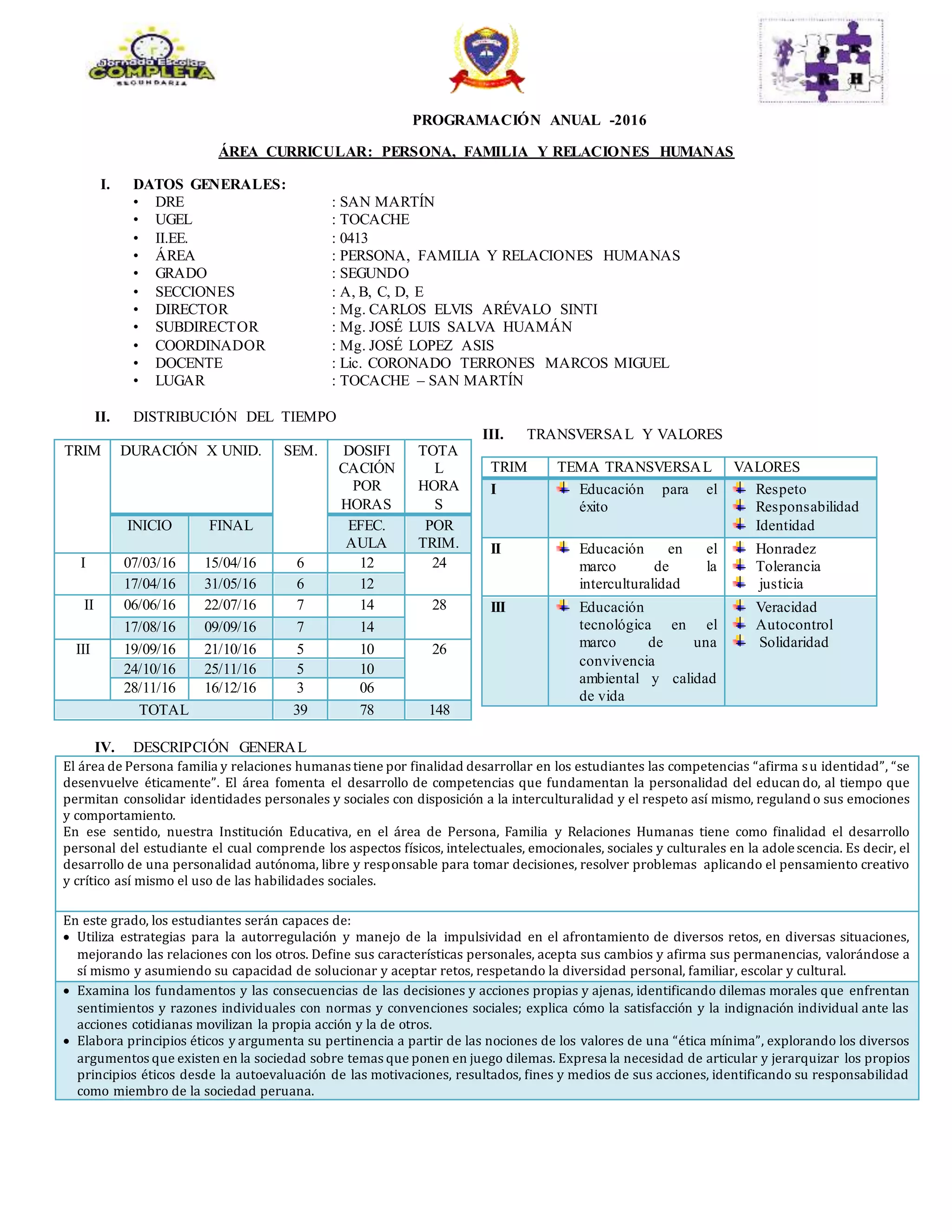 Este documento presenta la programación anual del área curricular de Persona, Familia y Relaciones Humanas para el grado segundo en una institución educativa de Tocache, San Martín. La programación describe los datos generales, la distribución del tiempo, los valores transversales, las unidades didácticas, los productos esperados, la vinculación con otras áreas y los materiales y recursos educativos. El objetivo principal es desarrollar en los estudiantes competencias como la afirmación de su identidad, el desenvolvimiento ético y la capacidad de relacionarse con los