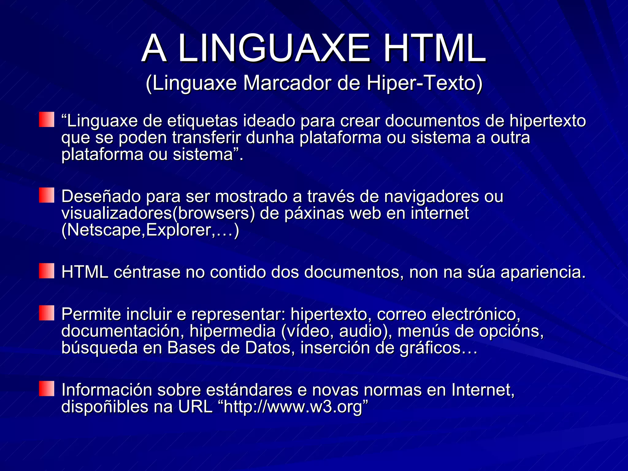 A LINGUAXE HTML(Linguaxe Marcador de Hiper-Texto) “ Linguaxe de etiquetas ideado para crear documentos de hipertexto que se poden transferir dunha plataforma ou sistema a outra plataforma ou sistema”. Deseñado para ser mostrado a través de navigadores ou visualizadores(browsers) de páxinas web en internet (Netscape,Explorer,…) HTML céntrase no contido dos documentos, non na súa apariencia. Permite incluir e representar: hipertexto, correo electrónico, documentación, hipermedia (vídeo, audio), menús de opcións, búsqueda en Bases de Datos, inserción de gráficos… Información sobre estándares e novas normas en Internet, dispoñibles na URL “http://www.w3.org”