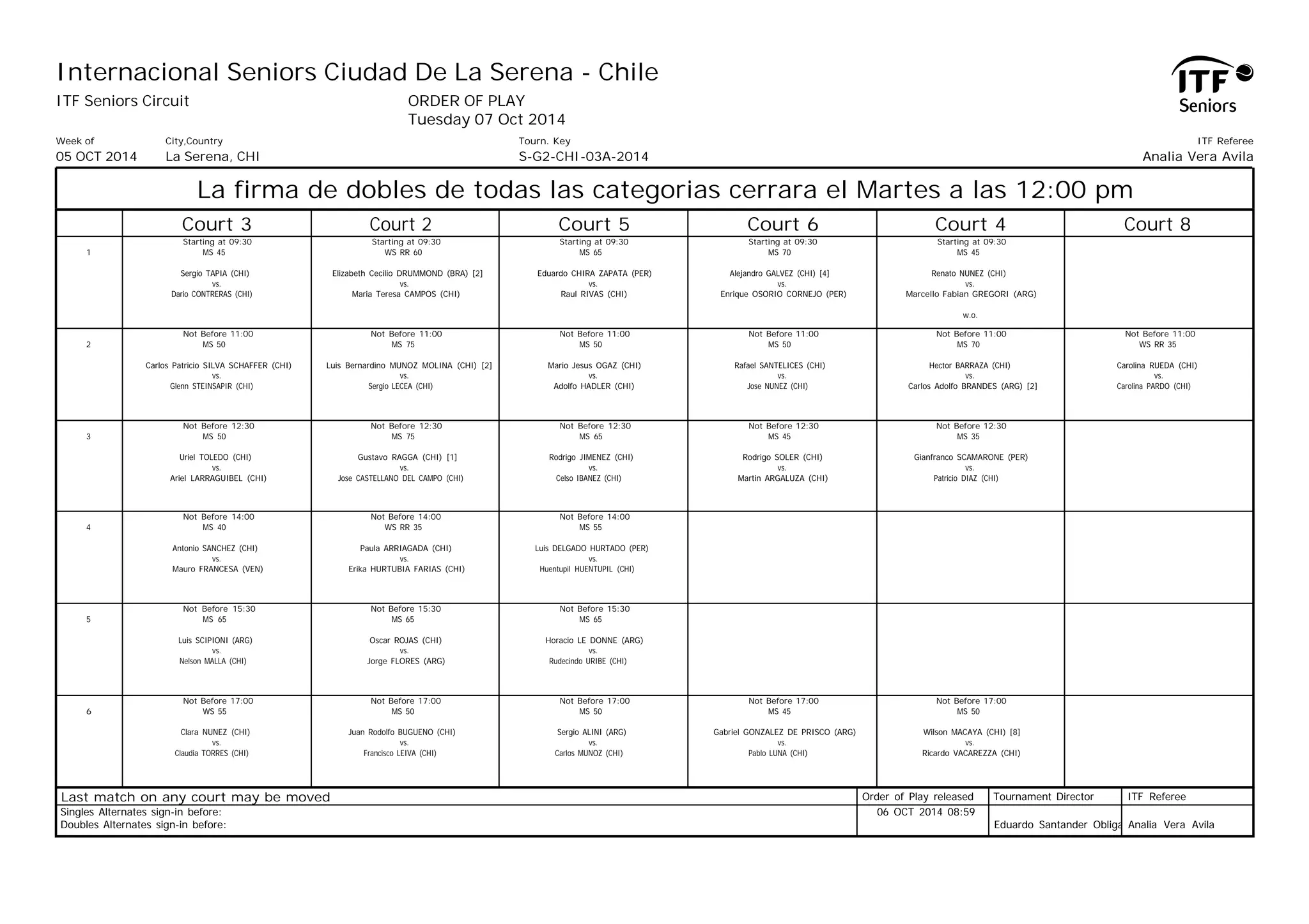 This document contains the order of play and schedule for the Internacional Seniors Ciudad De La Serena tennis tournament in La Serena, Chile from October 5-7, 2014. It lists over 50 singles and doubles matches between international male and female competitors aged 35-75 that are scheduled to take place across 6 courts on October 7th, beginning at 9:30am and continuing until 5pm. The tournament is sanctioned by the International Tennis Federation and organized by the Chile Tennis Federation.