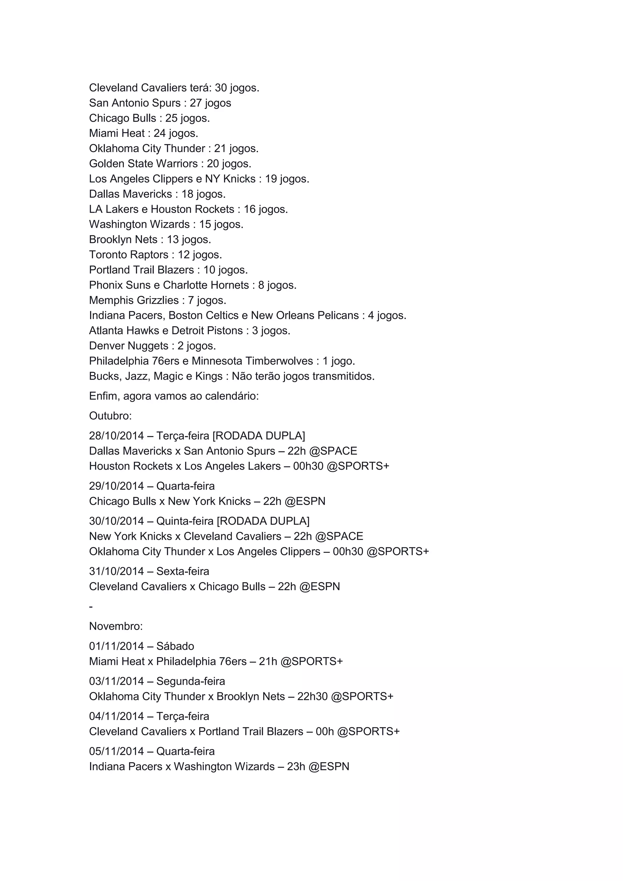 The document lists the NBA games that will be broadcasted in Brazil for the 2014-2015 season. It shows that the Cleveland Cavaliers will have the most games broadcasted with 30, followed by the San Antonio Spurs with 27. It then provides the broadcast schedule for games in October 2014 through March 2015, listing the teams playing, date, time and television channel for each game.