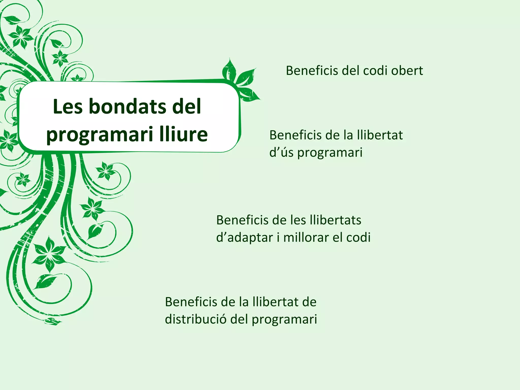 Beneficis del codiobert Beneficis de les llibertats d’adaptar i millorar el codi Beneficis de la llibertat d’ús programari Beneficis de la llibertat de distribució del programari Les bondats del programari lliure