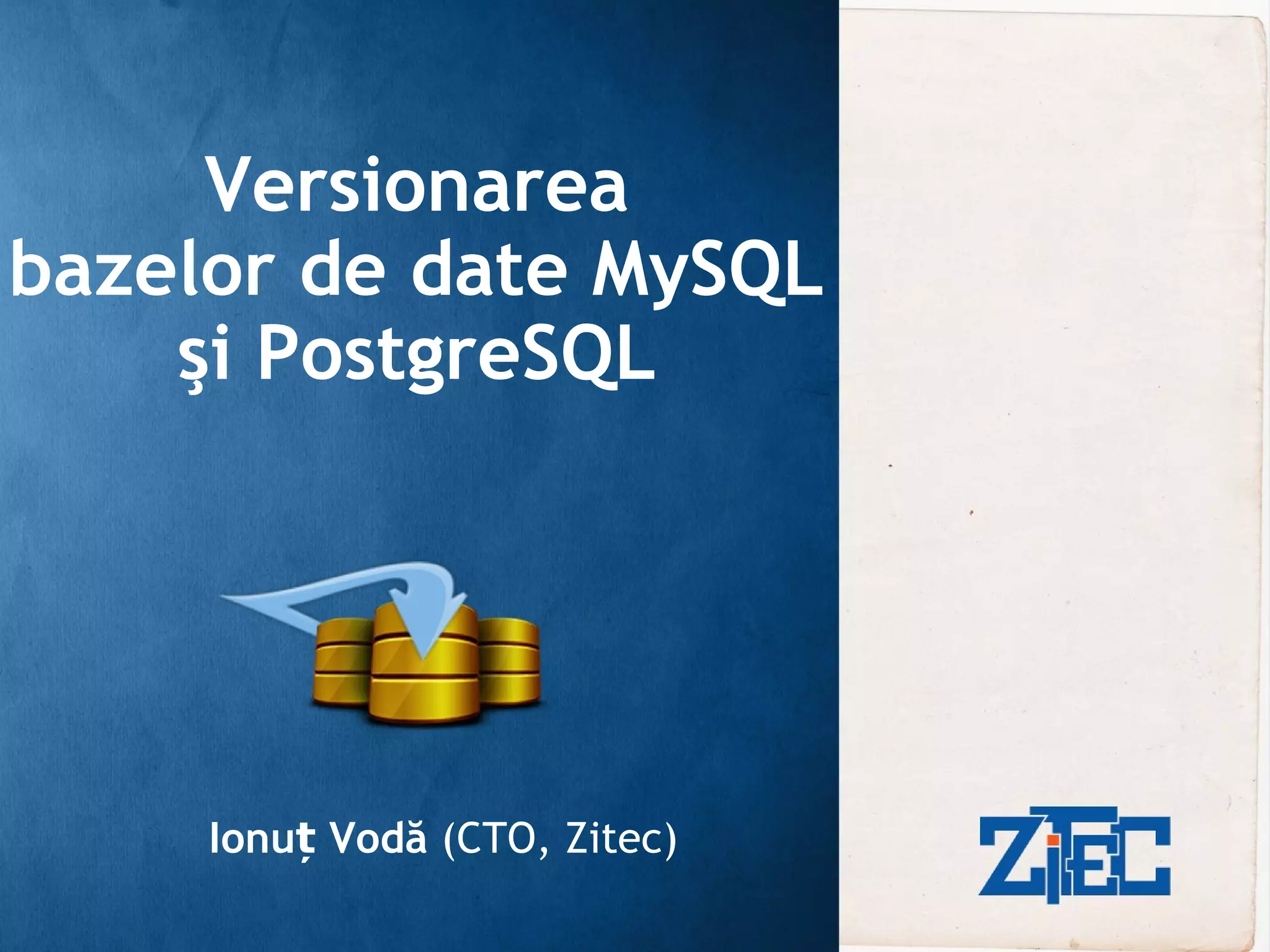 Documentul abordează versionarea bazelor de date MySQL și PostgreSQL, evidențiind aspectele esențiale ale gestionării codului sursă și istoricul modificărilor. Se discută despre instrumente și tehnici specifice, precum scripturi de schimbare și gestionarea conflictelor, subliniind importanța sincronizării între cod și baza de date. De asemenea, se clarifică ce nu reprezintă un sistem de versionare, cum ar fi backup-urile sau sincronizarea serverelor.