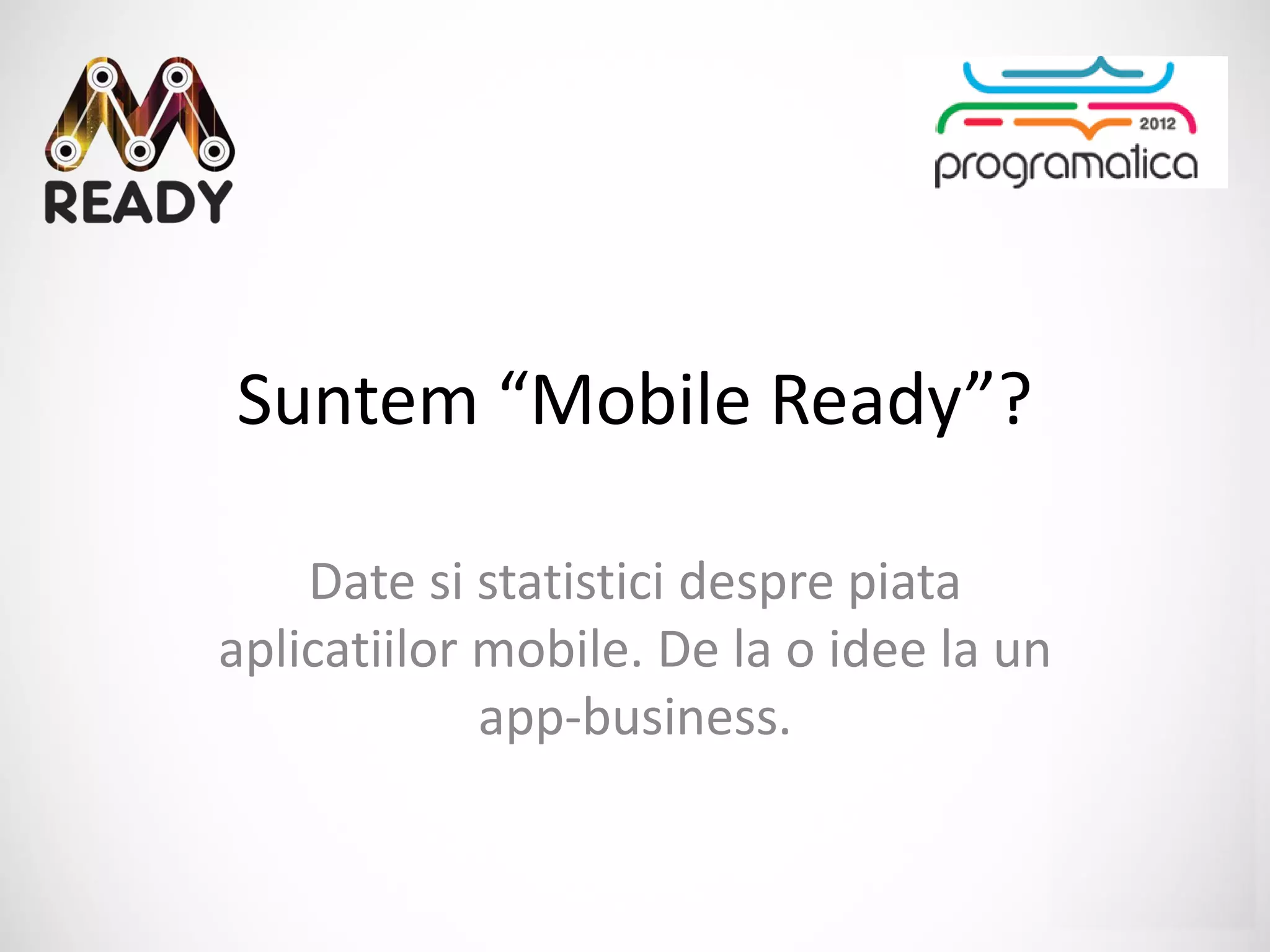 Documentul discută evoluția pieței aplicațiilor mobile, evidențiind o creștere semnificativă a valorii sale, de la 5 miliarde de dolari în 2010 la 38 de miliarde de dolari în 2015. Se analizează diverse aspecte precum tipurile de aplicații, nevoile utilizatorilor, canalele de distribuție și modelele de venit, subliniind importanța de a înțelege publicul țintă. În final, se propune un model de dezvoltare a produsului care include testarea conceptului și validarea clienților pentru a asigura succesul aplicației.
