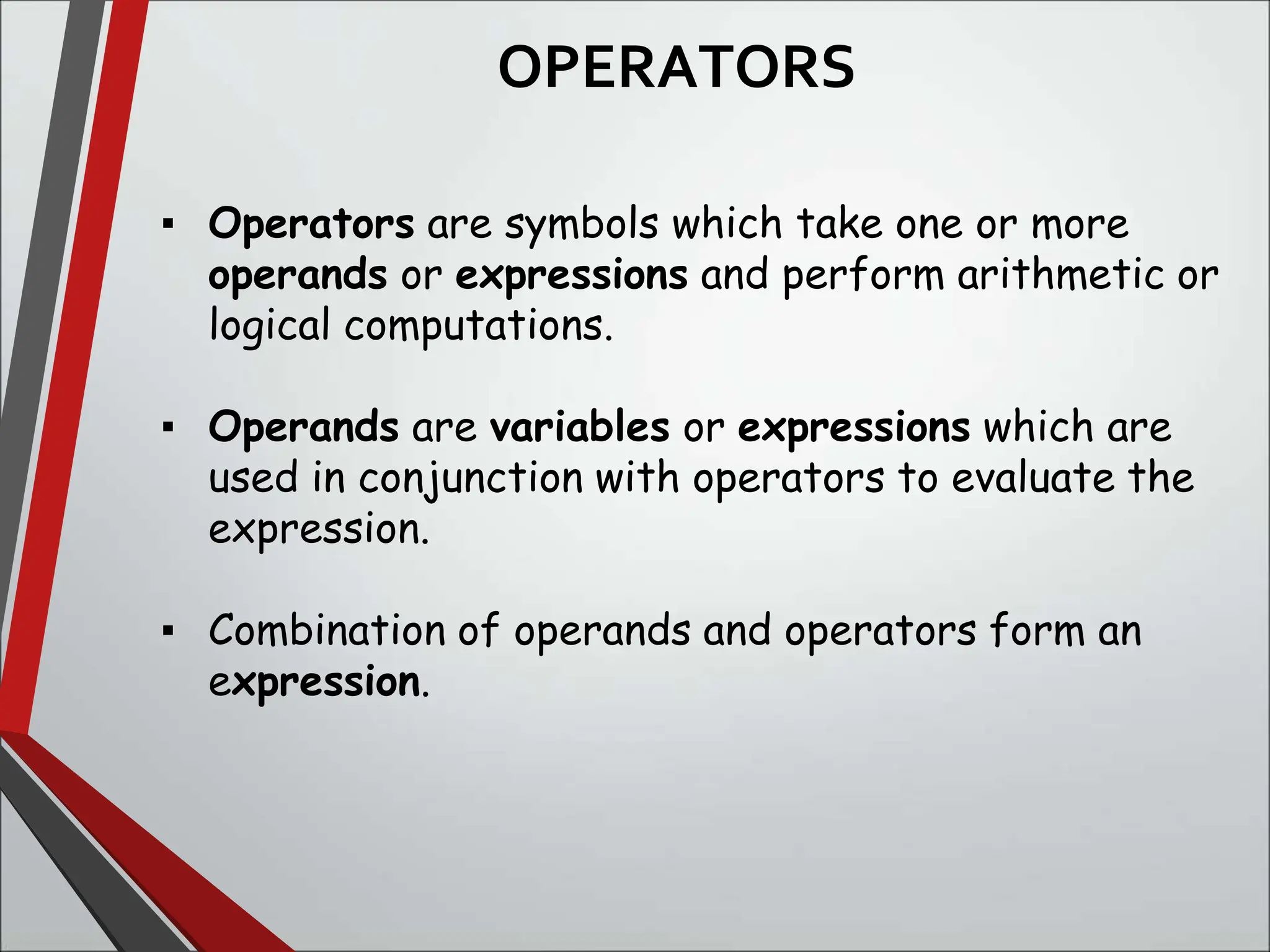 This document discusses arithmetic operators in C language. It defines operators as symbols that take operands and perform computations. Operands are variables or expressions used with operators. Combining operands and operators forms expressions. Arithmetic operators are binary operators that take two numeric operands and perform addition, subtraction, multiplication, division, and modulus operations. The order in which operators are evaluated, known as precedence and associativity, is also discussed along with an example program demonstrating arithmetic operators.