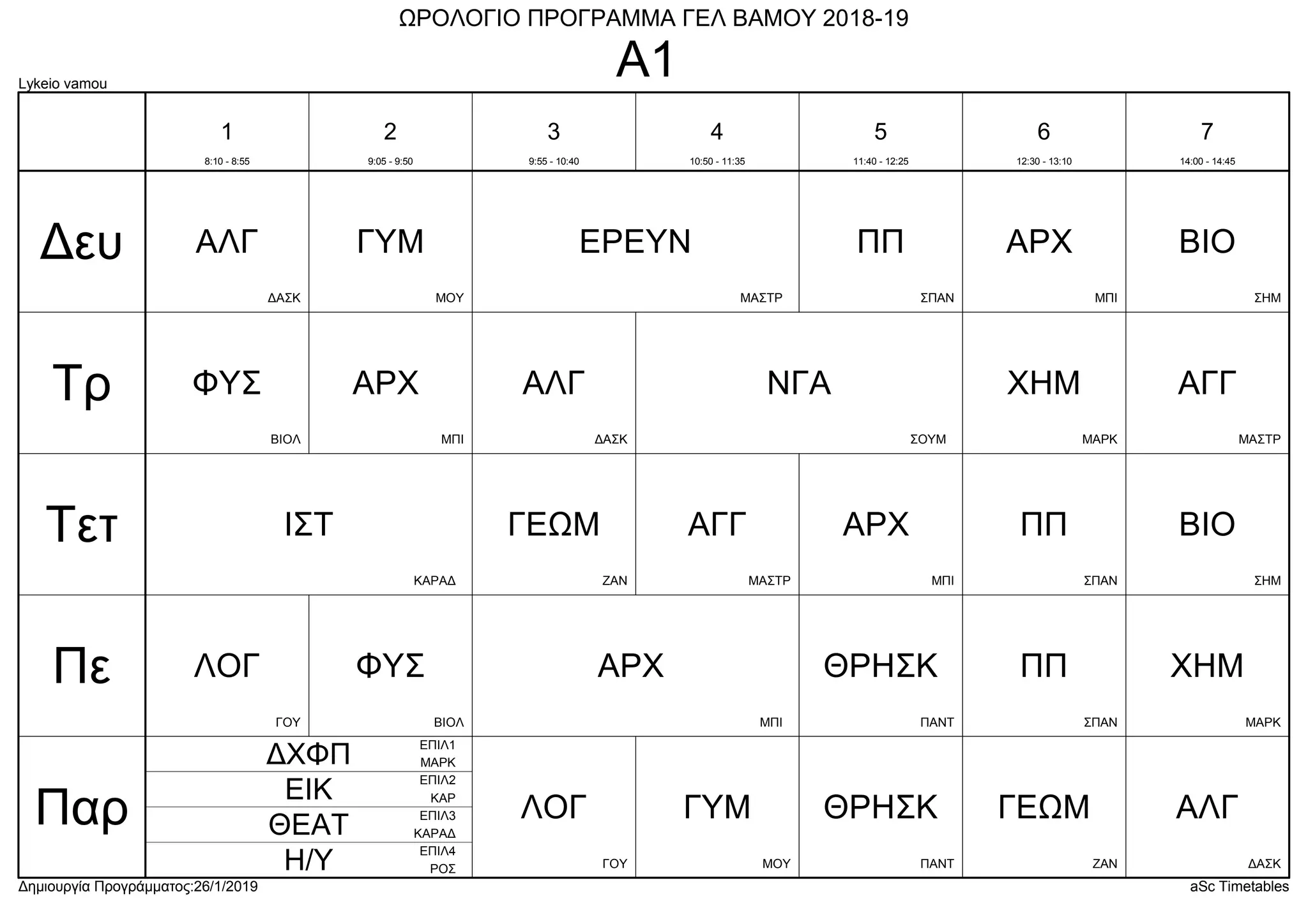 Δημιουργία Προγράμματος:26/1/2019aSc Timetables
