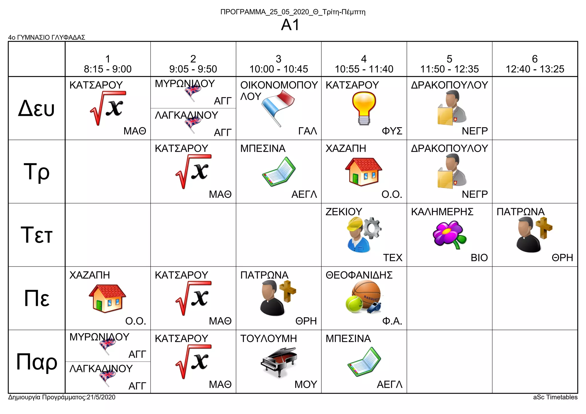 Προγράμματος:21/5/2020 aSc Timetables ΑΓΓ ΜΥΡΩΝΙΔΟΥ ΑΓΓ ΛΑΓΚΑΔΙΝΟΥ ΜΑΘ ΚΑΤΣΑΡΟΥ ΝΕΓΡ ΔΡΑΚΟΠΟΥΛΟΥ ΦΥΣ ΚΑΤΣΑΡΟΥ ΓΑΛ ΟΙΚΟΝΟΜΟΠΟΥ ΛΟΥ Ο.Ο. ΧΑΖΑΠΗ ΜΑΘ ΚΑΤΣΑΡΟΥ ΝΕΓΡ ΔΡΑΚΟΠΟΥΛΟΥ ΑΕΓΛ ΜΠΕΣΙΝΑ ΒΙΟ ΚΑΛΗΜΕΡΗΣ ΘΡΗ ΠΑΤΡΩΝΑ ΤΕΧ ΖΕΚΙΟΥ Ο.Ο. ΧΑΖΑΠΗ ΜΑΘ ΚΑΤΣΑΡΟΥ ΘΡΗ ΠΑΤΡΩΝΑ Φ.Α. ΘΕΟΦΑΝΙΔΗΣ ΜΟΥ ΤΟΥΛΟΥΜΗ ΑΓΓ ΜΥΡΩΝΙΔΟΥ ΑΓΓ ΛΑΓΚΑΔΙΝΟΥ ΜΑΘ ΚΑΤΣΑΡΟΥ ΑΕΓΛ ΜΠΕΣΙΝΑ Δευ Τρ Τετ Πε Παρ 1 8:15 - 9:00 2 9:05 - 9:50 3 10:00 - 10:45 4 10:55 - 11:40 5 11:50 - 12:35 6 12:40 - 13:25 ΠΡΟΓΡΑΜΜΑ_25_05_2020_Θ_Τρίτη-Πέμπτη Α1