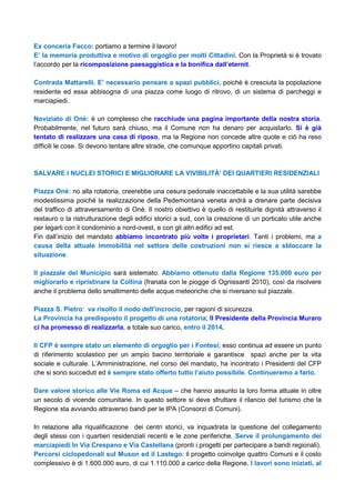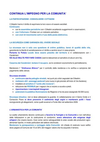 Il documento delinea le priorità dell'amministrazione locale riguardo alla sicurezza, all'urbanistica e al coinvolgimento della comunità, evidenziando l'importanza della partecipazione dei cittadini e della prevenzione in vari ambiti come la sicurezza stradale e ambientale. Inoltre, si sottolinea la necessità di riqualificazione dei centri storici e un sostegno al commercio locale, insieme all'impegno per il sociale e lo sport. Infine, si menzionano le difficoltà economiche e la ricerca di risorse esterne per completare progetti importanti come la nuova palestra.