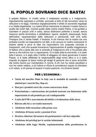 Il popolo italiano si ribella contro il malgoverno e rivendica la sovranità negata, unendo forze diverse in una protesta legittima. Propongono misure economiche, sociali e istituzionali per migliorare la situazione del paese, tra cui il ritorno alla lira, abolizione di privilegi e riforme fiscali. Aiutano a riportare dignità all'essere italiani, chiedendo diritti e responsabilità per ogni cittadino.