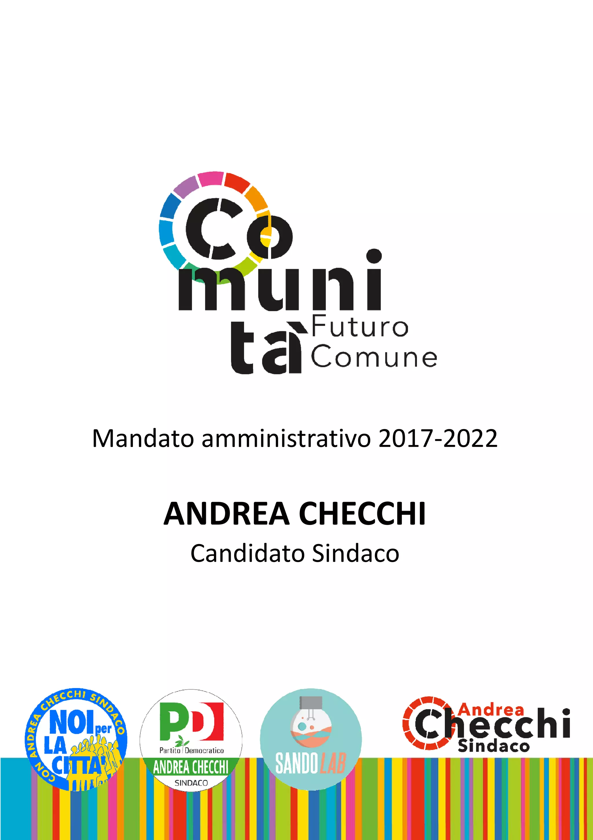 Il programma amministrativo di Andrea Checchi per il mandato 2017-2022 si propone di continuare il lavoro della coalizione di centrosinistra a San Donato Milanese, focalizzandosi su partecipazione e rete di relazioni tra cittadini. La strategia include lo sviluppo sostenibile, con obiettivi chiave come il benessere, la scuola, la sicurezza e la valorizzazione del territorio. Si punta a creare luoghi di comunità e incentivare il commercio locale, con un'attenzione particolare alla rigenerazione urbana e alla riduzione del consumo di suolo.