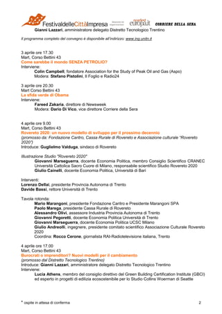 Il documento descrive un programma ricco di eventi e conferenze incentrati sull'innovazione, la sostenibilità e lo sviluppo economico, tenutosi a Rovereto e Schio. Tra gli interventi di rilievo, si evidenziano le partecipazioni di figure illustri come Jeremy Rifkin e Fareed Zakaria, con focus su energie rinnovabili e nuovi modelli di sviluppo. Il festival include anche attività educative e spettacoli, mirati a coinvolgere la comunità e le istituzioni nella discussione su temi attuali e futuri.