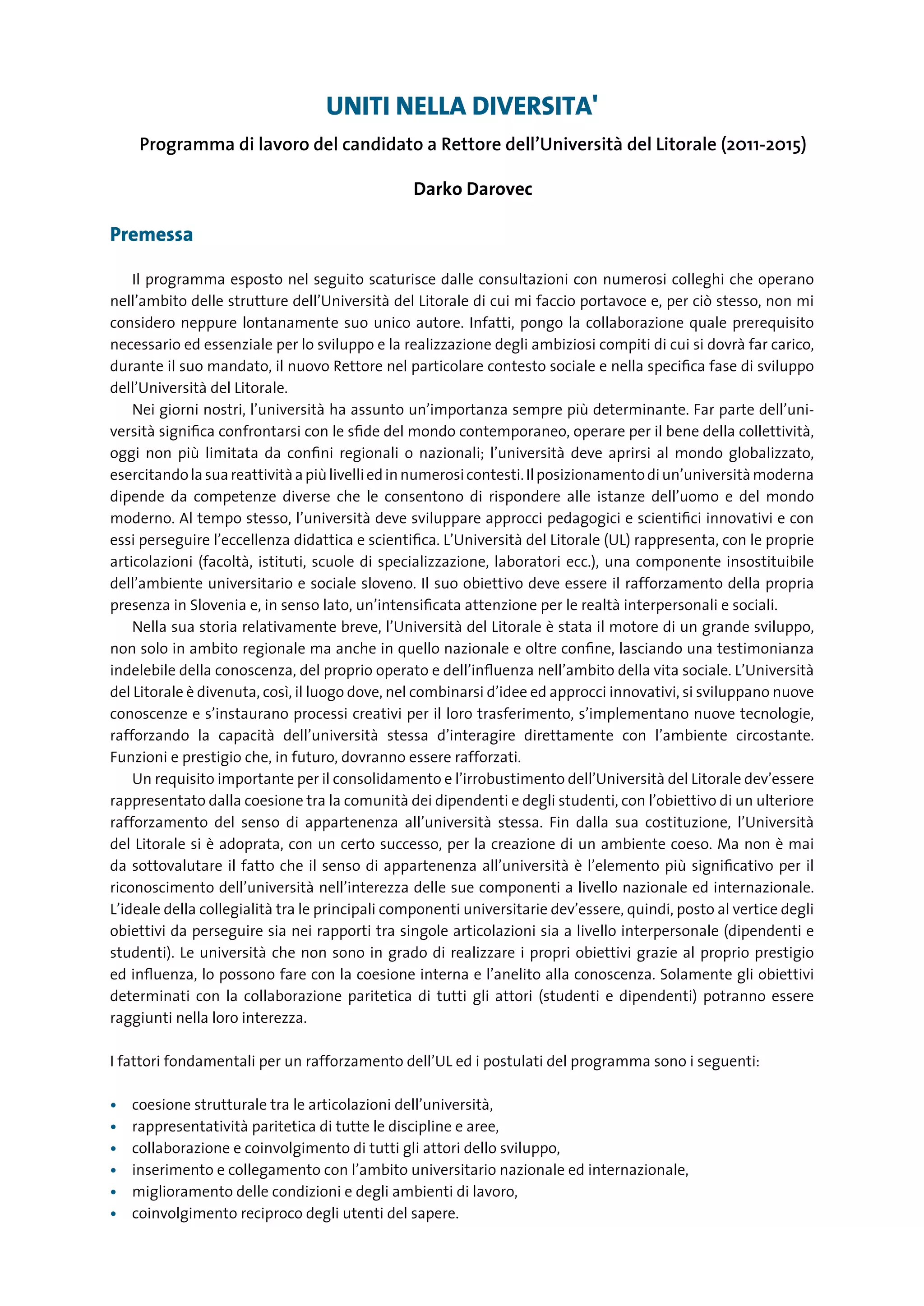 Il programma di lavoro del candidato a rettore dell'Università del Litorale per il periodo 2011-2015 enfatizza la collaborazione e la coesione interna tra studenti e dipendenti come elementi fondamentali per l'eccellenza accademica e la crescita dell'università. L'obiettivo è rafforzare le attività didattiche e di ricerca attraverso l'integrazione delle diverse articolazioni e la rappresentatività paritetica di tutte le discipline. Il programma si propone anche di migliorare le condizioni di lavoro e di creare sinergie con l'ambiente esterno per il coinvolgimento nella comunità accademica nazionale e internazionale.