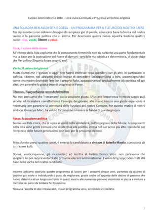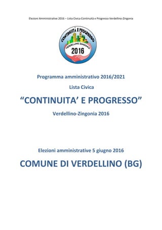 Il programma elettorale della lista civica 'Continuità e Progresso' per le elezioni amministrative di Verdellino-Zingonia propone una visione di un comune più bello, solidale e innovativo, con un forte focus su istruzione, sicurezza e servizi sociali. La candidata sindaco, Luisella Mastio, punta a costituire una squadra coesa e inclusiva, valorizzando la partecipazione di donne e giovani nella politica locale. Il programma si basa su principi di sostenibilità e realizzabilità, rispondendo alle esigenze della comunità e promuovendo azioni concrete per migliorare la qualità della vita dei cittadini.